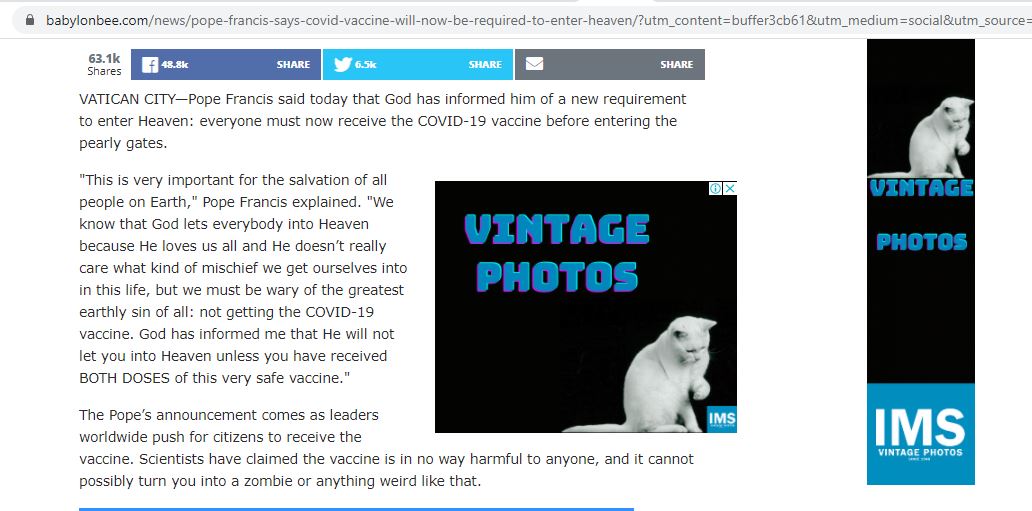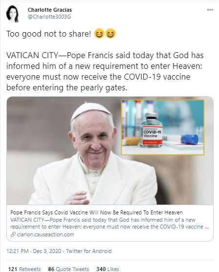 وجاء فيها أن "البابا فرنسيس قال اليوم إن الله أبلغه بشرط جديد لدخول الجنة: يجب أن يتلقى الجميع الآن لقاح COVID-19 قبل دخول البوابات اللؤلؤية". كذلك، زعمت قوله إن "تلقي جرعتين من اللقاح الجدير بالثقة "سيحرر فورًا أقاربك المتوفين من المطهر" و"قد يخفض وقتك هناك إلى النصف"...