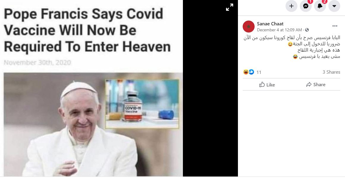 الوقائع: تكثّف التشارك في التصريح المزعوم للبابا فرنسيس خلال الأيام الماضية، لا سيما في صفحات وحسابات بالعربية (مثل هنا، هنا...)، وبالانكليزية (هنا، هنا، هنا...). "البابا فرنسيس صرّح بأن لقاح كوفيد سيكون من الآن ضروريا للدخول إلى الجنة"، وفقا للمزاعم. وقد أرفقت بمقالة بالانكليزية بالعنوان ذاته: Pope Francis Says Covid Vaccine Will Now Be Required To Enter Heaven".