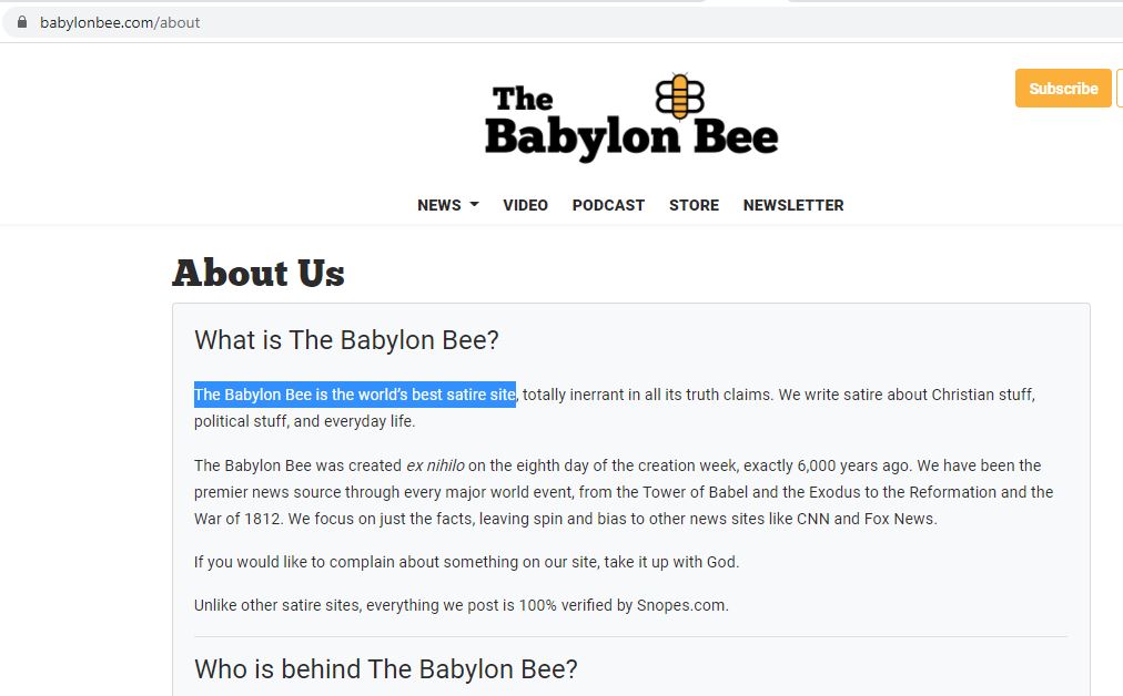 غير أن هذه المقالة محض خيال، ولا صحة اطلاقا لما تزعمه، ذلك أن موقع The Babylon Bee ساخر، وفقا لما يعرّف بنفسه. وبالتالي فإن كل المقالات التي ينشرها من نسج الخيال... للسخرية والتسلية.