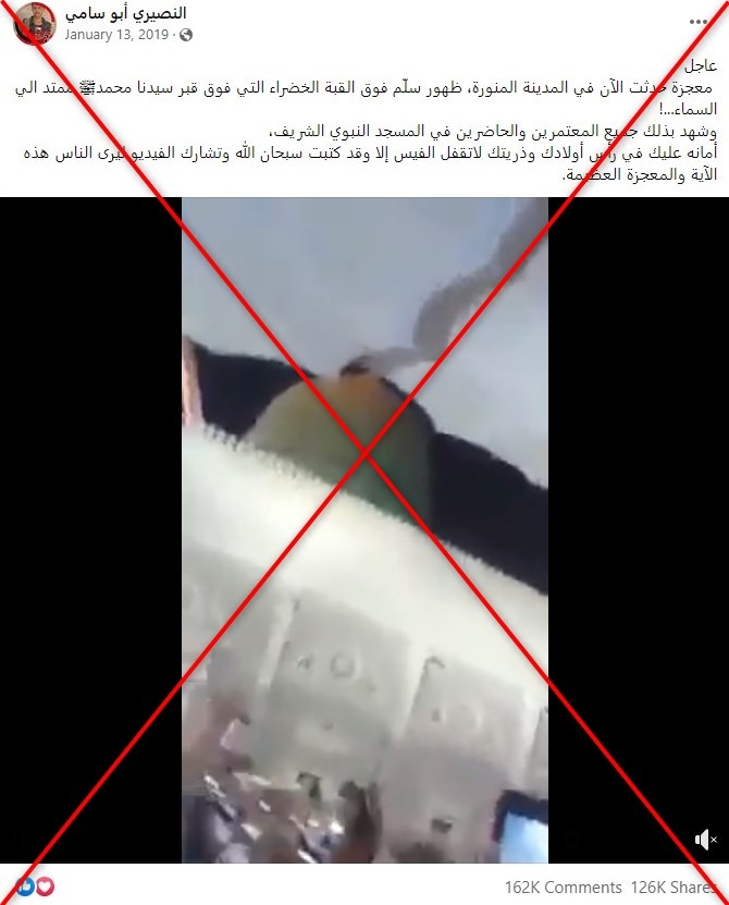 مئات آلاف المشاركات حققها خلال السنوات الماضية فيديو، يعود إلى التداول مع كلّ موسم حجّ، يدّعي ناشروه أنّه يصوّر "معجزة ظهور سلّم نحو السماء" فوق قبّة المسجد النبوي في المدينة المنوّرة. إلا أنّ ما يظهر في الفيديو حقيقة هو الفراغ بين المظلّات في باحة المسجد.