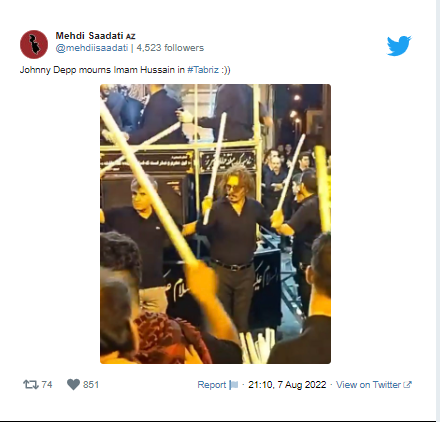 الوقائع: منذ ساعات، تكثّف التشارك في الصورتين عبر حسابات (هنا، هنا، هنا، هنا، هنا، هنا، هنا، هنا...)، مرفقتين بالمزاعم الآتية: "جوني ديب يشارك الشيعة في مجالس العزاء"، و"جوني ديب يبكي الحسين".