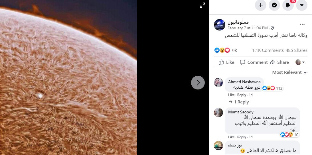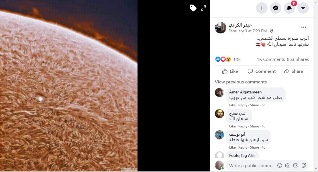 الوقائع: منذ ايام، يتكثف التشارك في الصورة، عبر صفحات، لا سيما في الفيسبوك (هنا، هنا، هنا، هنا...). وقد أرفقت بالمزاعم الآتية (من دون تدخل أو تصحيح): "أقرب صورة لسطح الشمس نشرتها ناسا"، وايضا "وكالة ناسا تنشر أقرب صورة التقطتها للشمس".