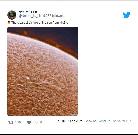 يزعم مستخدمون لوسائل التواصل الاجتماعي ان هذه الصورة هي "أقرب لقطة لسطح الشمس نشرتها وكالة الفضاء الأميركية الناسا". غير أن هذا الادعاء لا اساس له. الناسا لا علاقة لها بالصورة. ومن التقطها هو المصوّر جايسون غينزل Jason Guenzel صاحب حساب The Vast Reaches، مستخدما في ذلك "تلسكوب شمسيا كشف التفاصيل المتشابكة للمجال المغناطيسي للشمس"، على ما يفيد. وهذه الصورة تختلف كليا عن "أقرب صور لسطح الشمس" نشرتها وكالة ناسا العام الماضي، وهي صور غير مسبوقة. FactCheck#