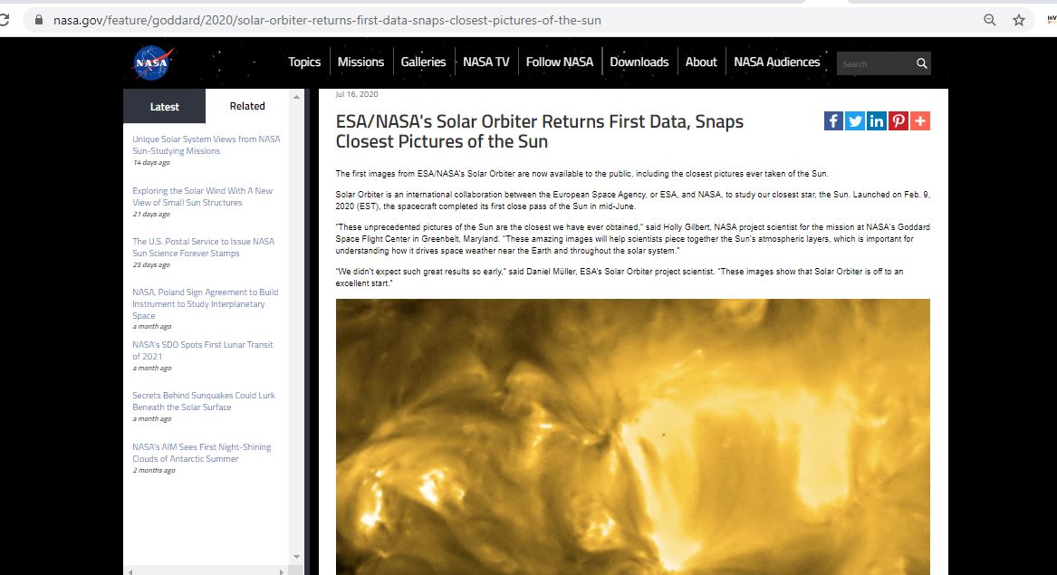 لكن الناسا التقطت بالفعل "أقرب صور لسطح الشمس"، وهي صور غير مسبوقة، ونشرتها في 16 تموز 2020. وقالت هولي جيلبرت Holly Gilbert، العالمة في مشروع ناسا في مركز غودارد لرحلات الفضاء التابع لناسا في غرينبيلت بولاية ماريلاند: "هذه الصور غير المسبوقة للشمس هي الأقرب التي حصلنا عليها على الإطلاق". و"ستساعد هذه الصور المذهلة العلماء في جمع طبقات الغلاف الجوي للشمس معًا، وهو أمر مهم لفهم كيفية تحرك الطقس الفضائي بالقرب من الأرض وفي جميع أنحاء النظام الشمسي".