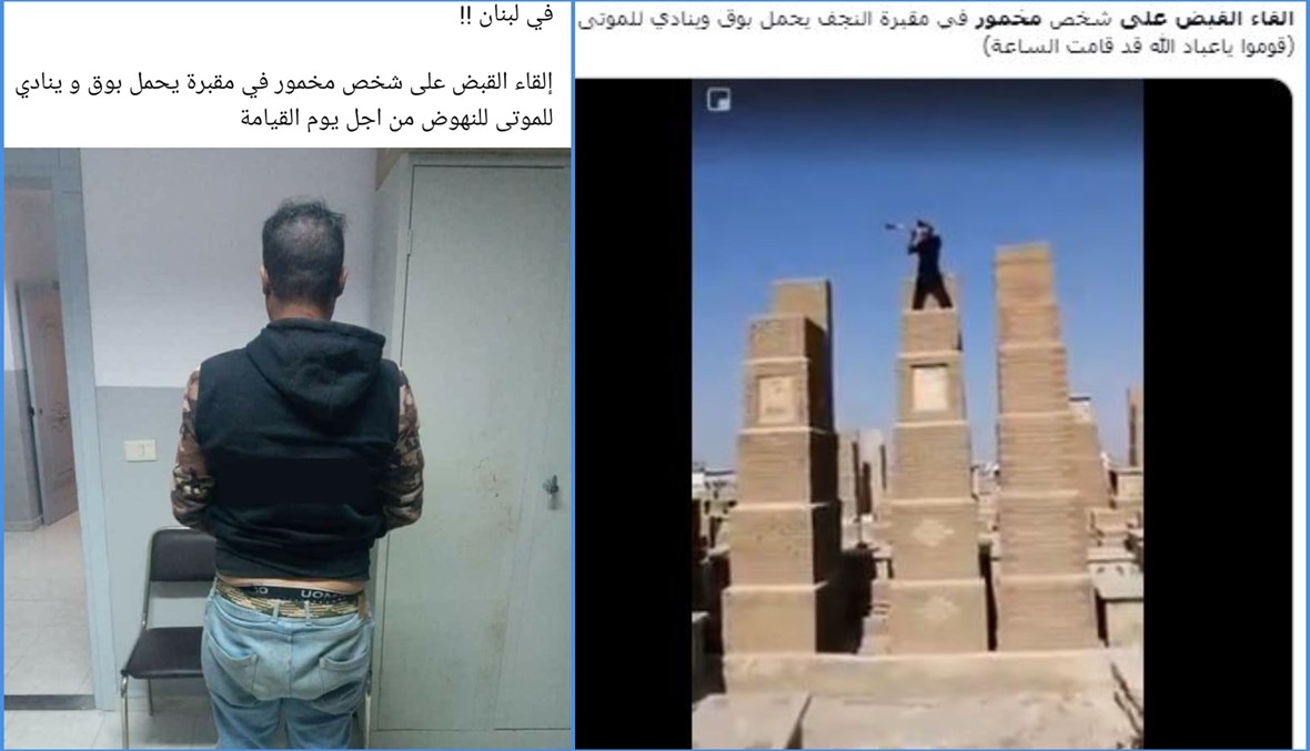 يتناقل مستخدمون لوسائل التواصل الاجتماعي صورة بمزاعم انها تظهر "شخصا مخمورا في مقبرة الغبيري في بيروت، يحمل بوقا وينادي الموتى للنهوض من اجل يوم القيامة"، بينما يدعي آخرون أن هذه الواقعة حصلت في المنستير بتونس. غير أن هذه المزاعم لا صحة لها. الواقعة شهدتها مقبرة بالنجف في العراق، والفيديو المتناقل للرجل قديم، اذ يعود الى عام 2019، وفقا لما توصّل اليه زملاؤنا في وكالة فرانس برس. أما الصورة المتناقلة، فلا علاقة لها بالواقعة، اذ تعود لرجل أوقفته الشرطة في بطبلبة جنوب المنستير التونسية، مع آخرين، "في قضاية مختلفة"، ونشرت تلك الصورة في كانون الاول 2020. FactCheck#
