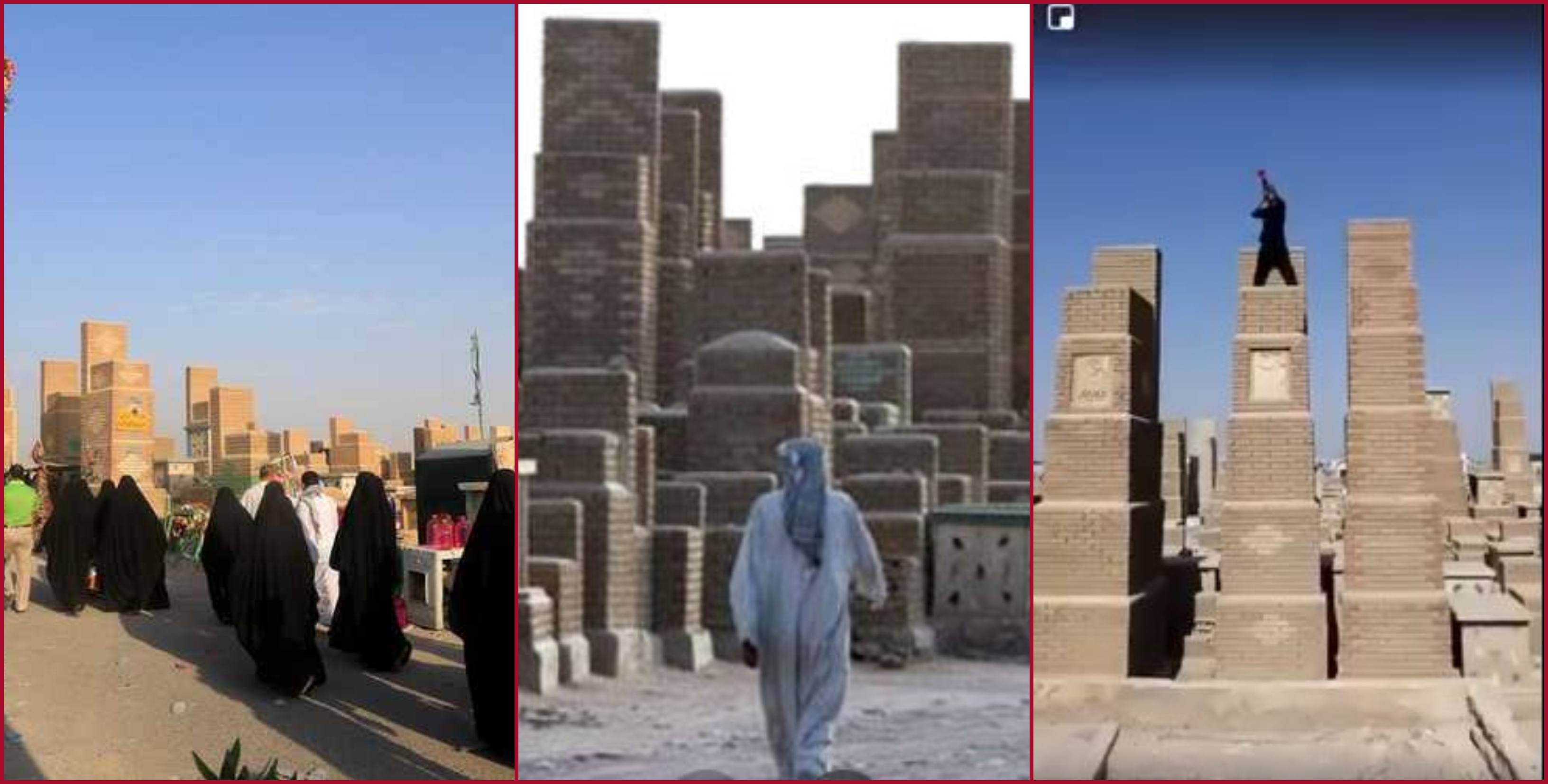 ولم نستطع الحصول على تأكيد حاسم ان المقبرة هي في النجف بالعراق، كما أوردت تلك المواقع الاخبارية. غير أنه أمكن ايجاد صورتين لقبور في مقبرة النجف (هنا، هنا- ادناه في الوسط والى اليسار) تشبه تصاميمها تلك التي تظهر في الفيديو المتناقل (الى اليمين).