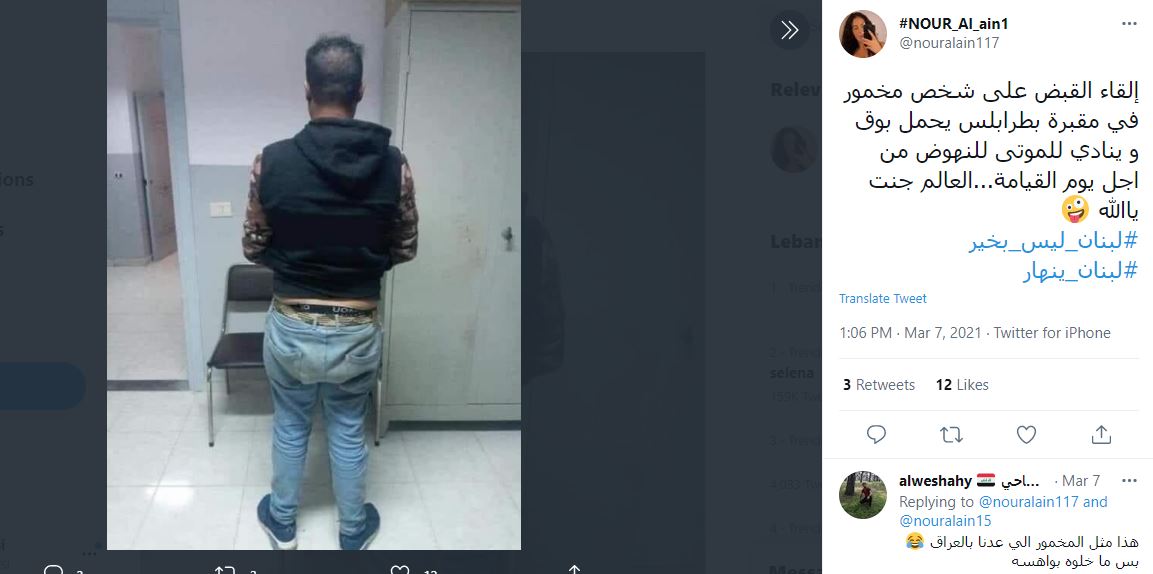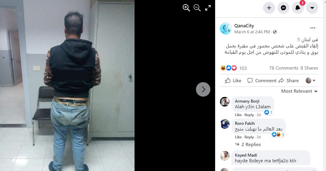 الوقائع: الصورة التقطت للرجل من الخلف فيما كان يقف في غرفة. منذ نحو يومين، تكثف تناقلها عبر صفحات وحسابات، لا سيما لبنانية، في الفيسبوك (هنا، هنا، هنا، هنا، هنا، هنا...)، وايضا تويتر (هنا، هنا...). وقد أرفقت بالمزاعم الآتية (من دون تدخل أو تصحيح): "في لبنان!! إلقاء القبض على شخص مخمور في مقبرة يحمل بوق وينادي للموتى للنهوض من اجل يوم القيامة"، وايضا "عاجل إلقاء القبض على شخص مخمور "في مقبرة الغبيري"، وايضا "في مقبرة في طرابلس"، "يحمل بوق وينادي للموتى للنهوض من اجل يوم القيامه".