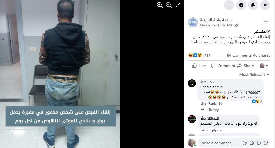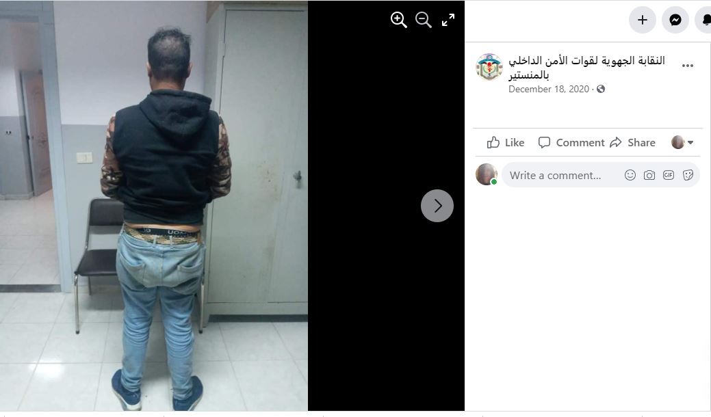 فالبحث باستخدام كلمات مفاتيح، مثل قوى الأمن الداخلي، تونس، والمنستير، نقع على صفحة النقابة الجهوية لقوات الأمن الداخلي بالمنستير في الفيسبوك، والتي نشرت صورة الرجل في 18 كانون الاول 2020، مشيرة الى انه تم توقيفه في بطبلبة جنوب المنستير، الى جانب آخرين في "قضايا مختلفة".