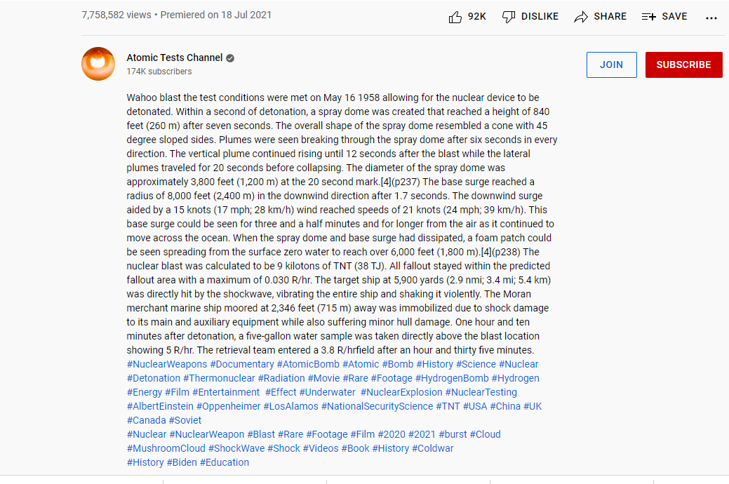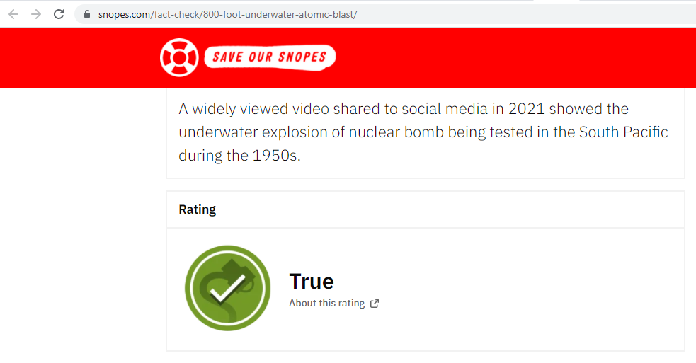 فالبحث عنه، بتجزئته الى مشاهد ثابتة (Invid)، يقودنا الى مصدره، قناة Atomic Tests Channel في يوتيوب، وهو الاسم الذي نقرأه في الفيديو المتناقل. وقد نشرته بنسخة اطول (1.23) في 18 تموز 2021 (هنا)، موضحة انه مقطع مصور يظهر "انفجارا ذريا على عمق 150 مترا تحت الماء، عام 1958". وحددت انه "انفجار واهو Wahoo"، الذي اجرته الولايات المتحدة، في "16 ايار 1958"، في المحيط الهادئ.