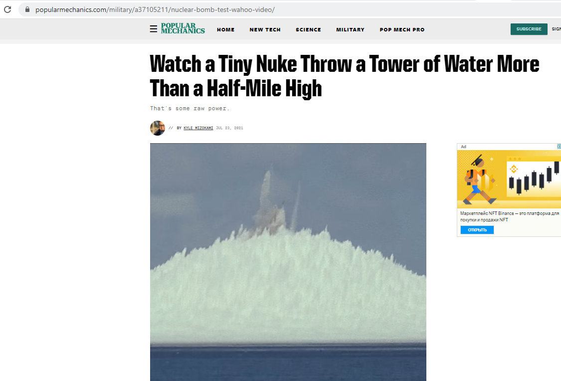 البحث باستخدام كلمات مفاتيح بالانكليزية، مثل Wahoo blast وMay 16 1958، وnuclear device، يضعنا امام موقع popular mechanics، الذي نشر مقالة بقلم كايل ميزوكامي KYLE MIZOKAMI في 23 تموز 2021 (هنا)، تكلم فيها على أصالة الفيديو بكونه "مقطعا مصوراً مكتشفاً حديثًا من الأيام الأولى للعصر الذري، ويُظهر القوة الخام للأسلحة النووية" الاميركية.