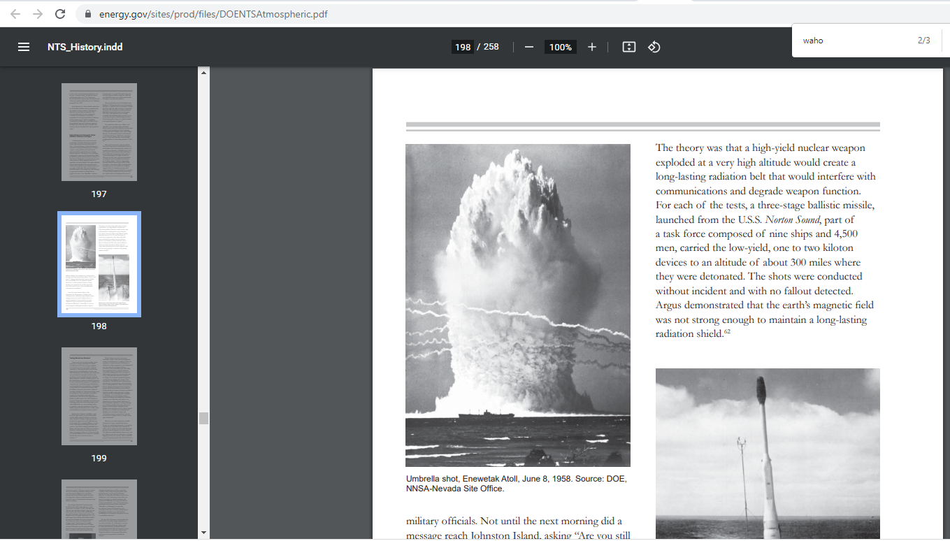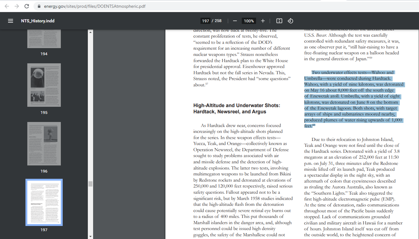 ما يجب معرفته هو ان تجربة واهو Wahoo النووية جاءت ضمن "عملية البسكويت الأولى Operation Hardtack I"، التي "تضمنت 35 اختبارًا اجرتها الولايات المتحدة الاميركية في المحيط الهادئ ونيفادا من 28 نيسان 1958 إلى 31 تشرين الاول 1958 (هنا، هنا).