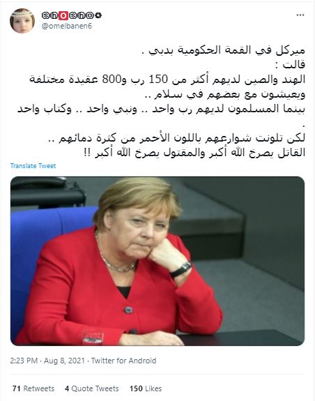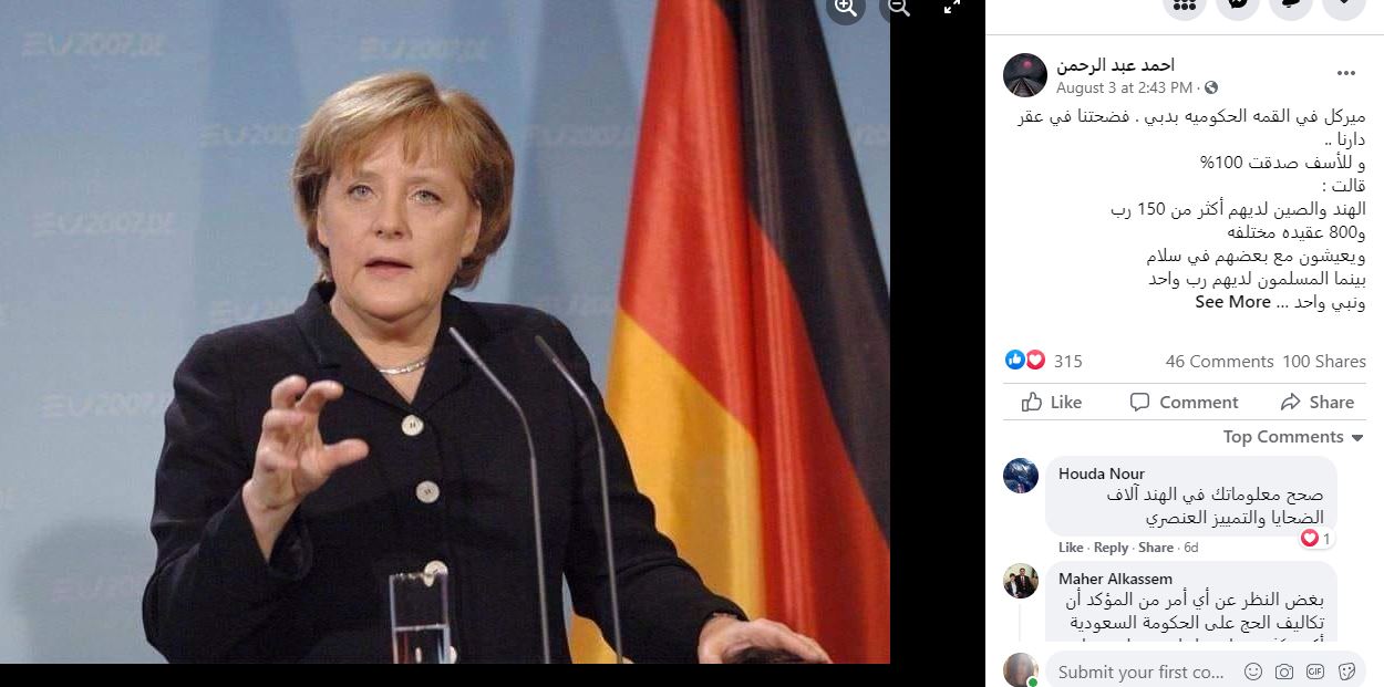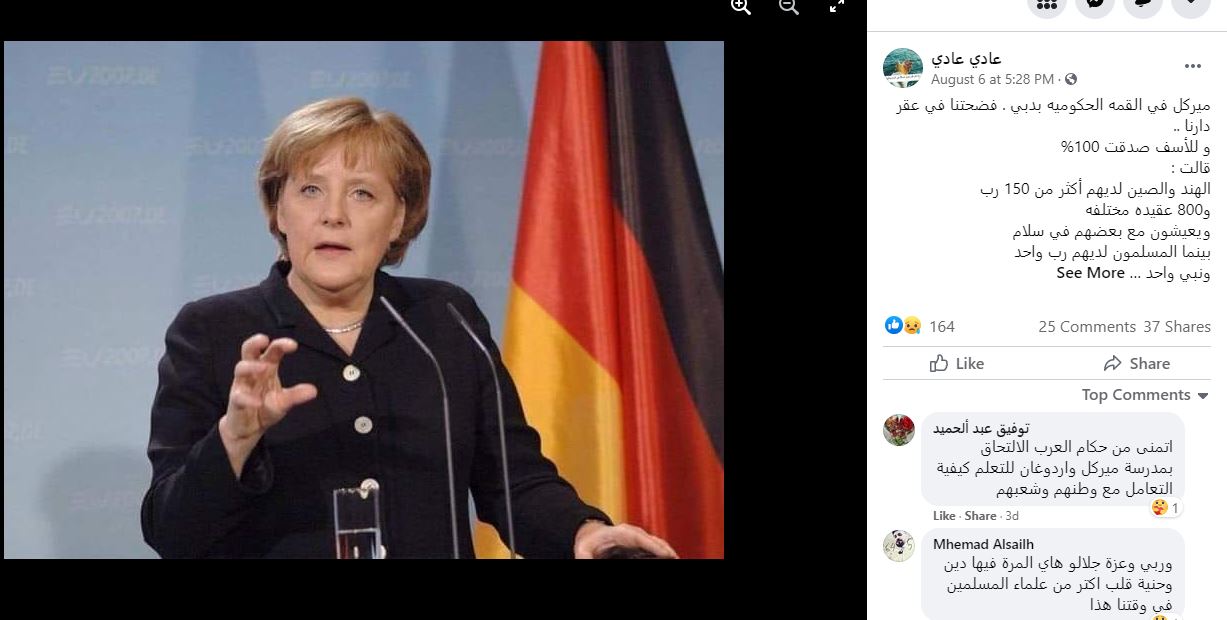 الكلام المتناقل في وسائل التواصل الاجتماعي منسوب الى المستشارة الالمانية انغيلا ميركل. ووفقا للمزاعم، "قالت ميركل خلال القمه الحكومية بدبي إن الهند والصين لديهما أكثر من 150 رباً و800 عقيدة مختلفة ويعيش الناس فيهما بسلام، بينما المسلمون لديهم رب واحد ونبي واحد وكتاب واحد، لكن شوارعهم تلونت بالأحمر من كثرة دمائهم...". غير أن هذه المزاعم لا اساس لها. فميركل لم تشارك في اي من اجتماعات القمة العالمية للحكومات المنعقدة سنويا في دبي بالإمارات، والكلام المنسوب اليها مختلق. FactCheck#
