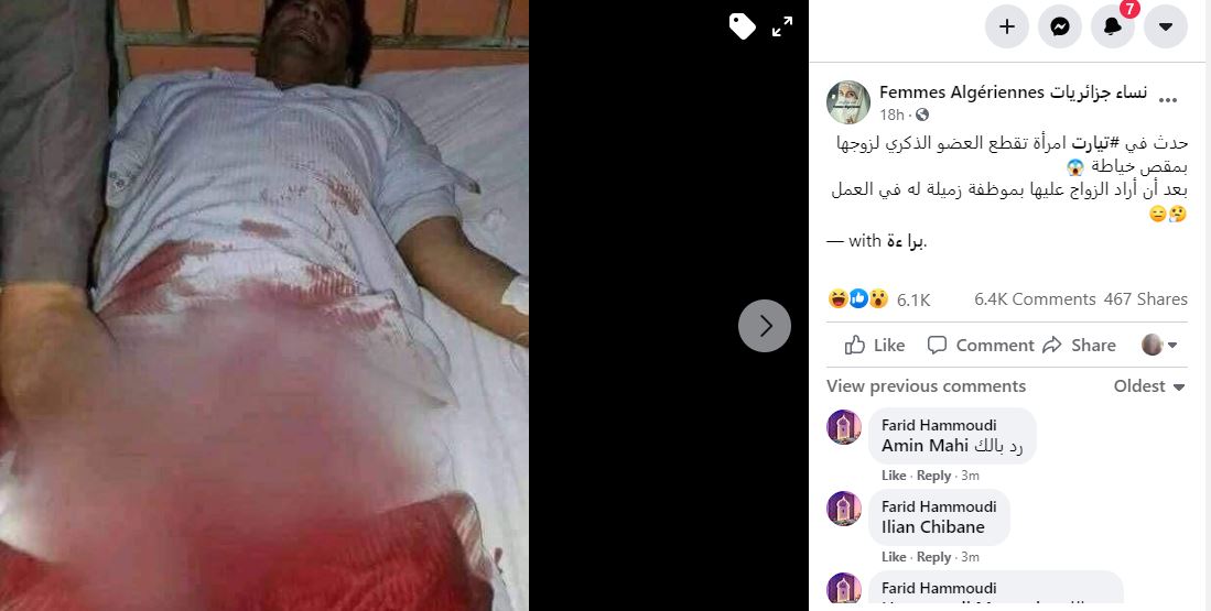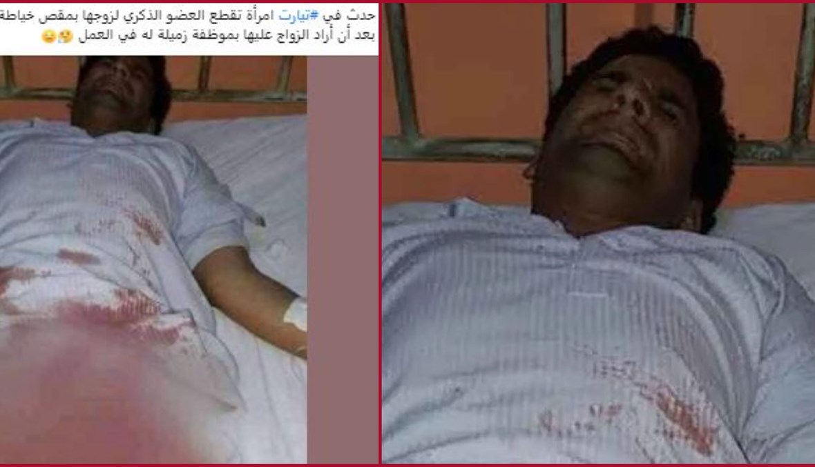 الوقائع: رجل تمدّد على سرير، وقد غطته الدماء. الصورة تكثف تناقلها في الساعات الماضية، في صفحات لا سيما في الفيسبوك (هنا، هنا، هنا، هنا، هنا، هنا...). وقد أرفقت بالمزاعم الآتية (من دون تدخل أو تصحيح): "اليوم قبل قليل في تيارت امرأة تقطع العضو الذكري لزوجها بمقص خياطة بسبب الرغبة بالزواج من موظفة. كل واحد ياخذ الخذر باله من لاغليغو". كذلك ذكر مستخدمون أن الواقعة حصلت في "محافظة المثنى" في العراق، بينما لم يحدد آخرون اي مكان للواقعة المزعومة.