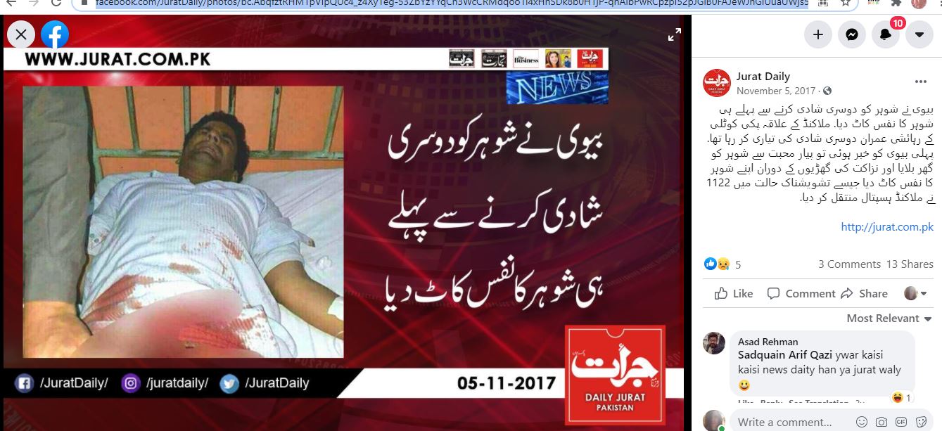 في المقابل، أمكن أيجاد صورة الرجل منشورة في مواقع اخبارية باكستانية (هنا، هنا)، عام 2017، وايضا في صفحات باكستانية في الفيسبوك (هنا، هنا، هنا، هنا). وفي المعلومات، ان الواقعة شهدتها قرية باكي كوتلي في سيالكوت الباكستانية، واسم الرجل عمران. و"قد أقدمت زوجته على فعلتها تلك في وقت كان يستعد للزواج من امرأة ثانية".