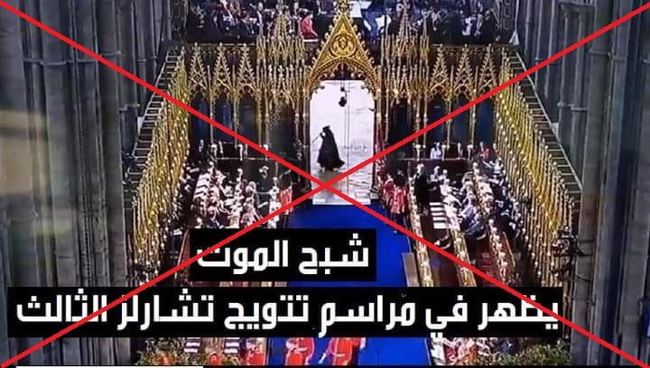 المتداول: صورة وفيديو يُظهران، وفقا للمزاعم، "شبح الموت خلال مراسم تتويج الملك تشارلز الثالث"، في كاتدرائية ويستمنستر في لندن، السبت 6 ايار 2023.