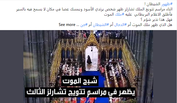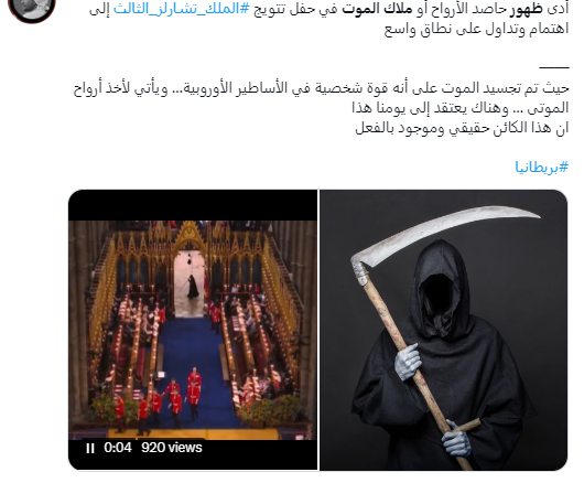 منذ ايام، تضجّ وسائل التواصل بصورة وفيديو، يظهر فيهما شخص غامض يمرّ بسرعة في الخلفية، بينما كانت مراسم تتويج الملك تشارلز الثالث قائمة. وقد تكثف التشارك فيهما عبر حسابات، عربية وأجنبية، أرفقتهما بتعليقات مثل: "شبح الموت يظهر في مراسم تتويج الملك تشارلز الثالث"، وايضا "أدى ظهور حاصد الأرواح Grim Reaper أو ملاك الموت في تتويج الملك تشارلز الثالث إلى اهتمام وتداول على نطاق واسع".