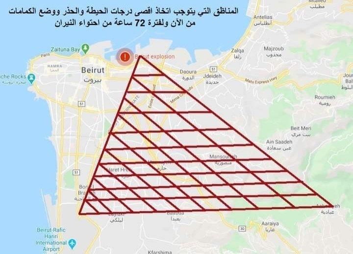 الوقائع: بعد اندلاع الحريق في مرفأ بيروت الخميس 10 منه، انتشرت خريطة في وسائل التواصل الاجتماعي، وايضا عبر الواتساب، حددت "المناطق التي يتوجب اتخاذ اقصى درجات الحيطة والحذر ووضع الكمامات من الآن، ولفترة 72 ساعة من الحتواء النيران"، على ما يكتب عليها. وقد حددت الخريطة تلك المناطق في مثلث أحمر شمل المرفأ، حارة حريك، برج البراجنة، الليلكي، بعبدا، الحازمية، العبادية، المنصورية، سن الفيل...