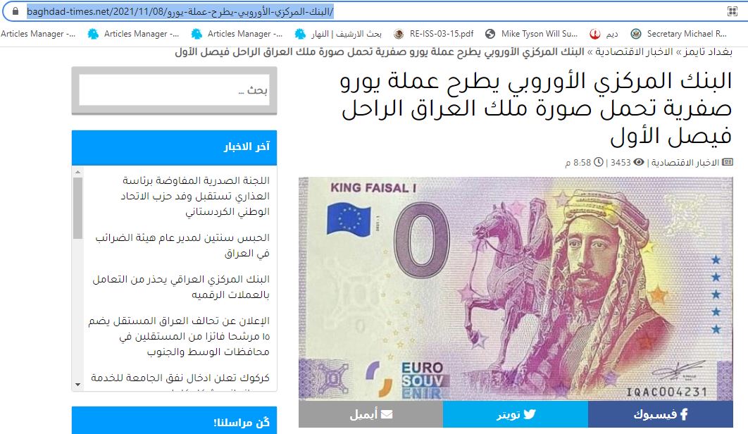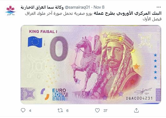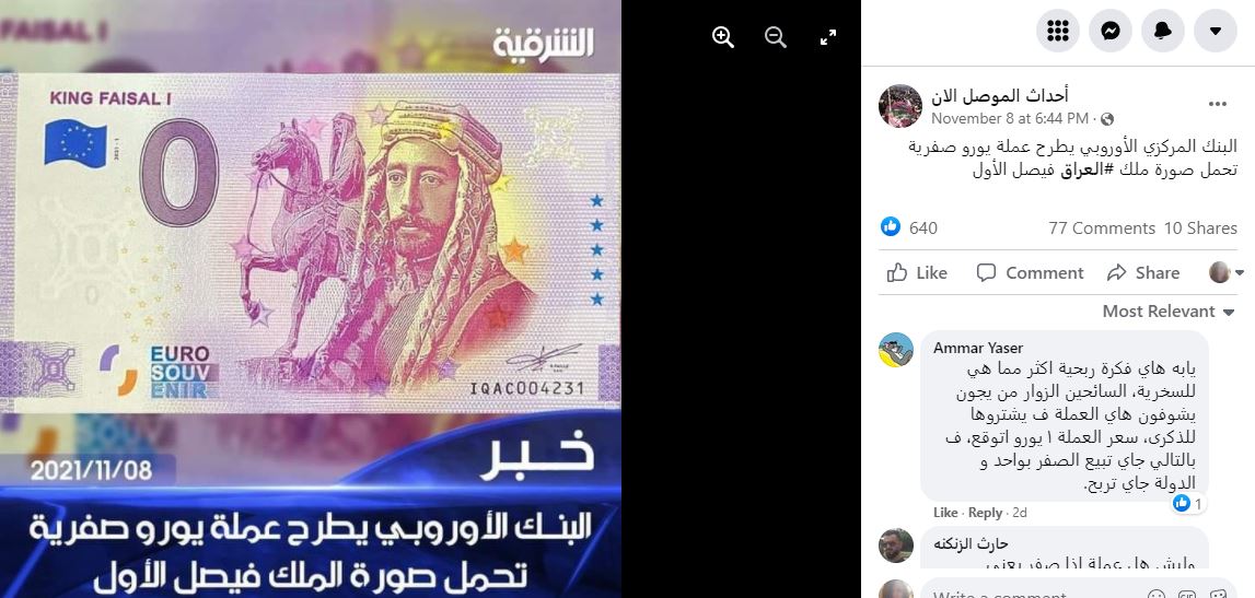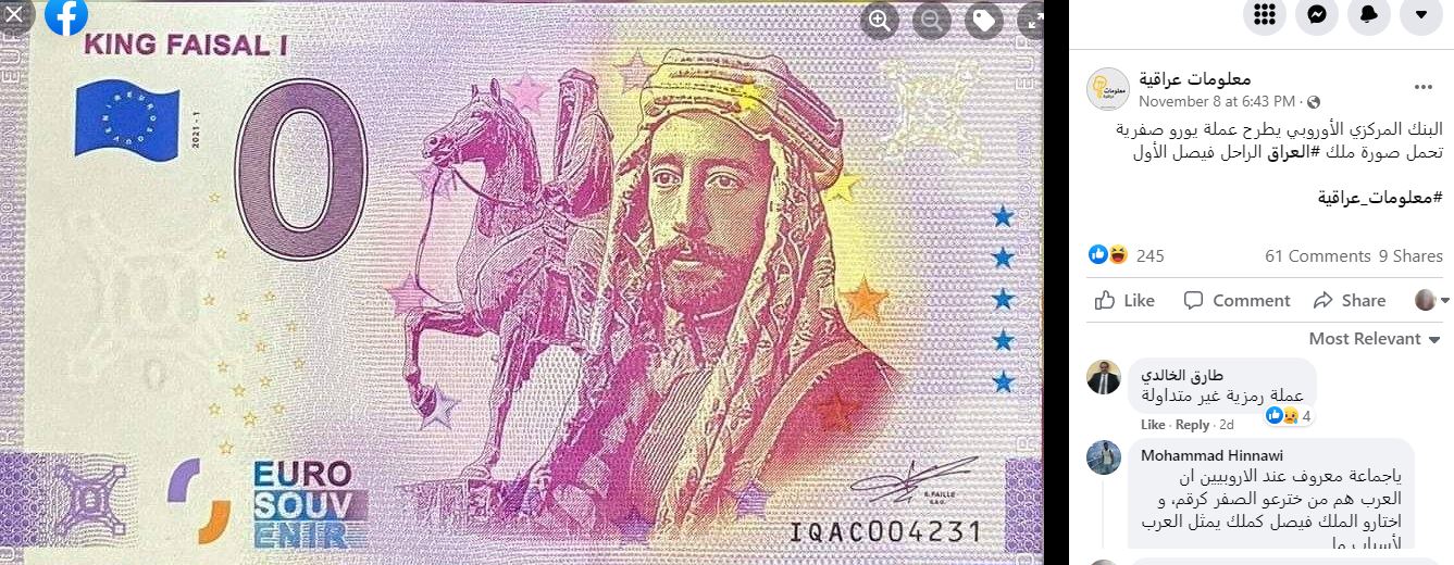 الصورة واضحة. عملة يورو صفرية تحمل صورة الملك فيصل الأول، ملك العراق الراحل (1883-1933). وفي المزاعم المتناقلة، ان "البنك المركزي الأوروبي هو الذي طرح هذه العملة". غير ان هذا الادعاء خاطئ. العملة الورقية المتداولة ورقة نقدية تذكارية فقط Euro Souvenir، وفقا لما يُقرأ عليها. والبنك المركزي الأوروبي "لا ينظم طرح مثل هذه الأوراق التذكارية ولا يعطي موافقته عليها"، بتأكيد منه. و"الأوراق النقدية الوحيدة باليورو التي يعترف بها البنك الاوروبي كعملة قانونية هي تلك التي تصدرها البنوك المركزية الوطنية في منطقة اليورو". FactCheck#