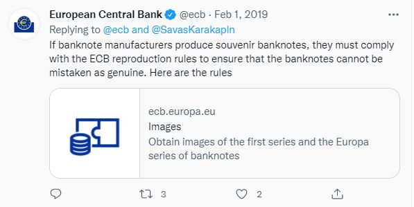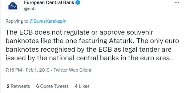 وقد أكد البنك ذلك بنفسه، في معرض رده على حساب في تويتر نشر ان "احدى الاوراق التذكارية من فئة 0 يورو الخاصة بكمال اتاتورك طرحها البنك". وقال البنك عبر حسابه الرسمي في تويتر: "لا ينظم البنك المركزي الأوروبي تلك الاوراق التذكارية أو يعطي موافقته عليها. الأوراق النقدية الوحيدة باليورو التي يعترف بها البنك المركزي الأوروبي كعملة قانونية هي تلك التي تصدرها البنوك المركزية الوطنية في منطقة اليورو".