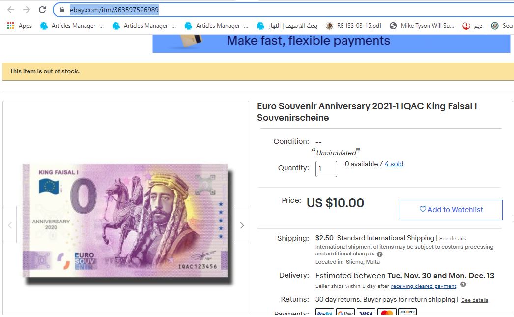 في واقع الأمر، يمكن ايجاد الصورة ذاتها لعملة اليورو الصفرية الخاصة بالملك فيصل الاول معروضة للبيع في مواقع متخصصة ببيع العملات التذكارية وغيرها (هنا، هنا...)، بسعر 7 أورو أو 10 دولارات.