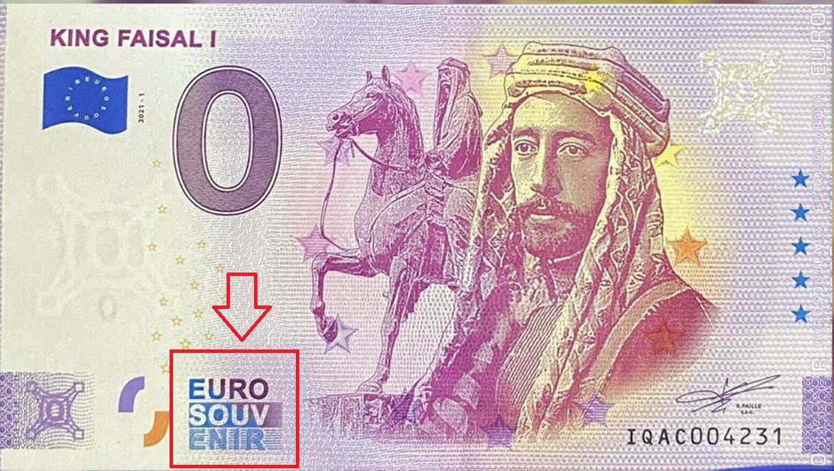 فعملة اليورو الصفرية المتداولة ورقة نقدية تذكارية Euro Souvenir، وفقا لما يُقرأ عليها بوضوح (ادناه بالاحمر).