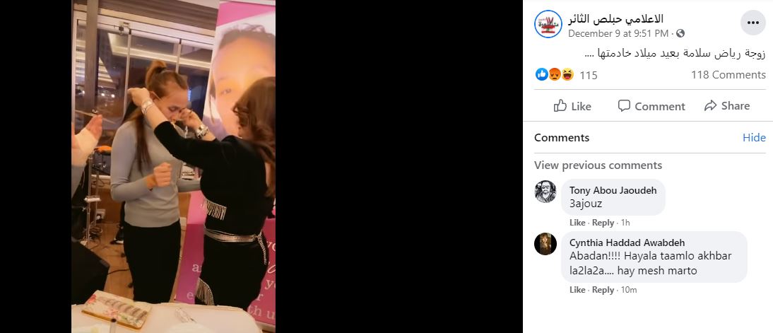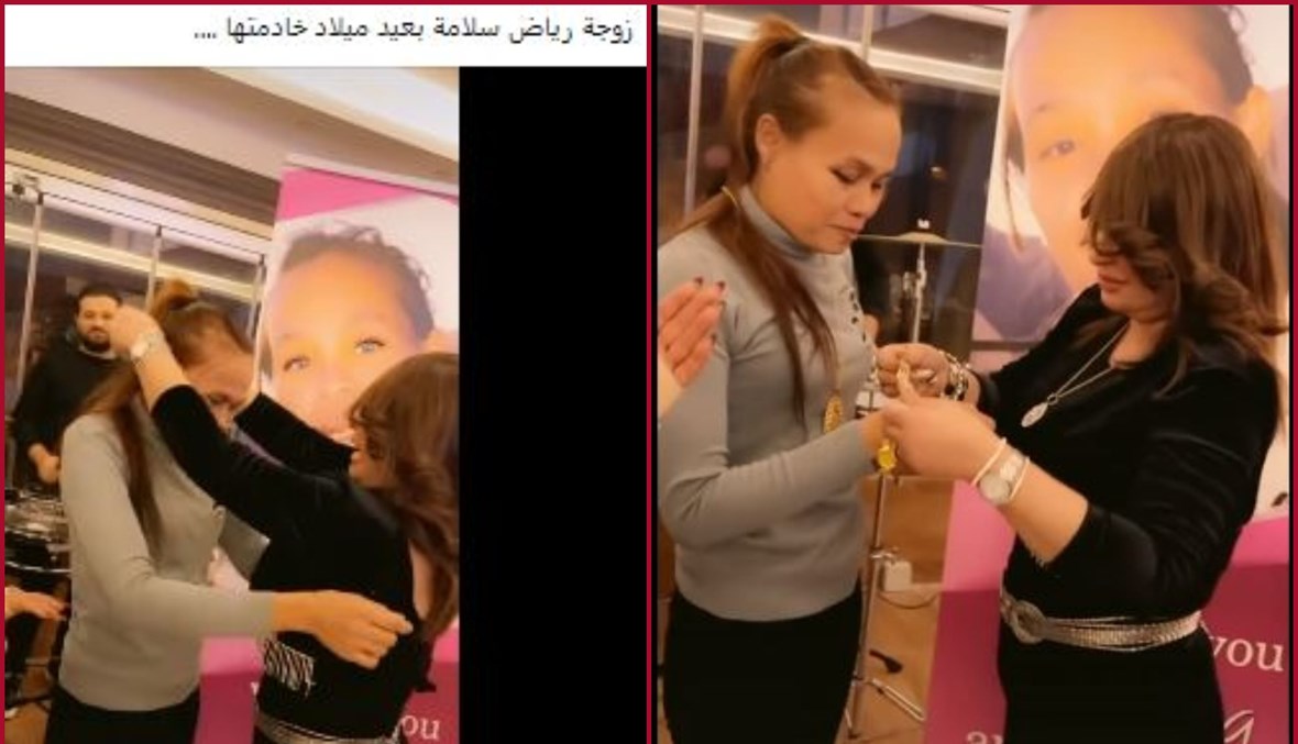 الوقائع: 1,03 دقيقة مدة الفيديو. المشاهد تكشف امرأة تقدم هدايا من ذهب الى امرأة أخرى، على وقع الموسيقى، بينما تحلق أشخاص آخرون حولهما، مصفقين. وقد تكثف تناقل الفيديو في صفحات وحسابات (هنا، هنا، هنا، هنا، هنا)، وايضا عبر الواتساب. وقد أرفق بالمزاعم الآتية (من دون تدخل): "زوجة رياض سلامة بعيد ميلاد خادمتها"، وايضا "زوجه رياض سلامه تهدي خادمتها في عيد ميلادها من اموال الشعب".