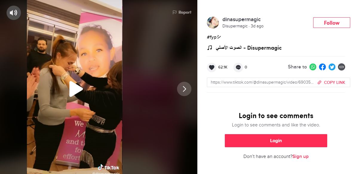 يحمل الفيديو المتناقل المفتاح للعثور على مصدره الأصلي. انظروا الى أسفل الشاشة، الى اليمين. يمكن قراءة dinasupermagic@ وTikTok.