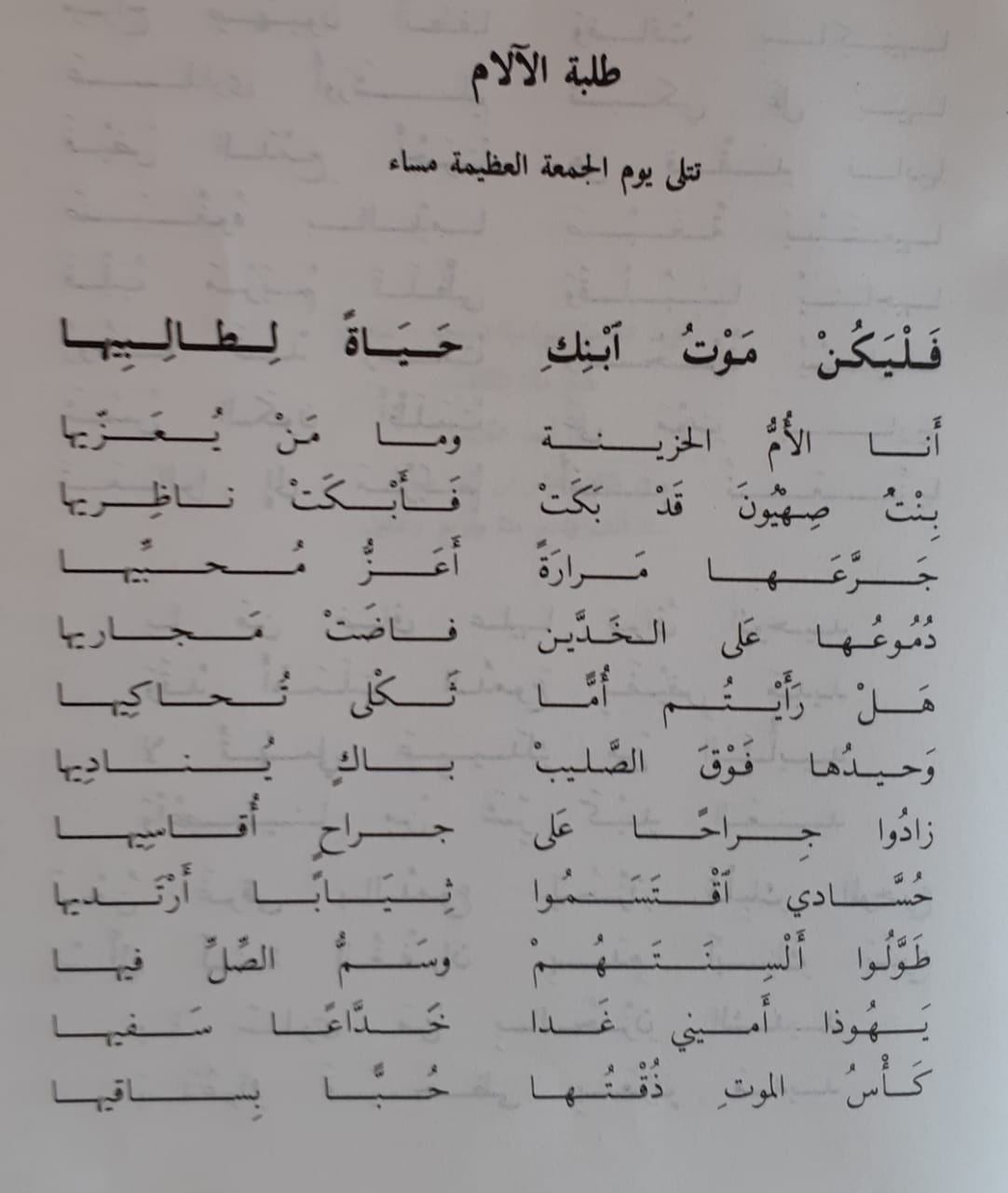 طلبة الآلام، في اسبوع الآلام... "أنا الأم الحزينة وما من يعزيها"، تقول الترتيلة. ما يجب معرفته ايضا عن هذا النوع من الطلبات، في التقليد الماروني، هو أنها تقال بحسب أحرف الابجدية، وفقا للترتيب السرياني. وهذا يعني أن كل بيت من ابيات طلبة الآلام يبدأ بأحرف الأبجدية السريانية أبجد، هوز، حطي، كلمن، سعفص، قرشت".