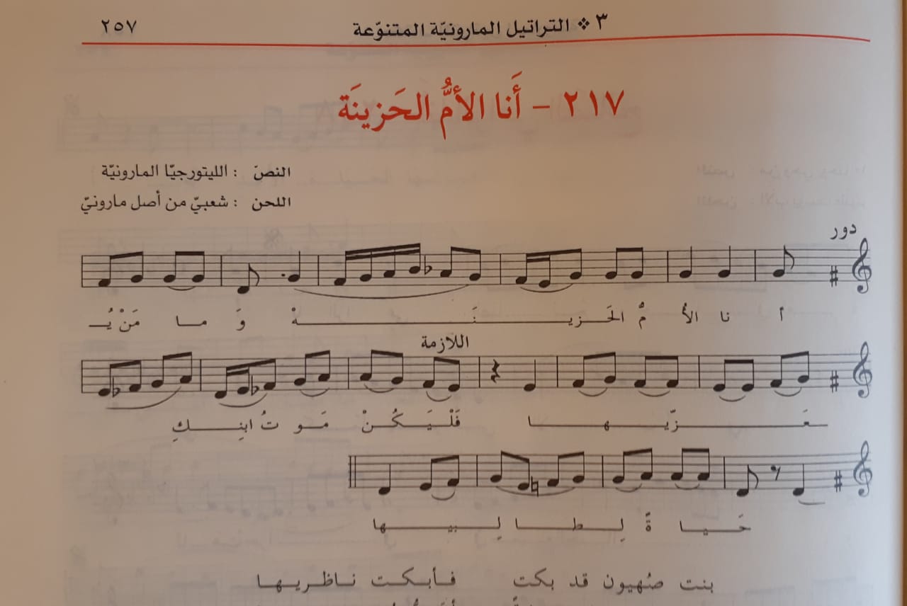 ويشرح الأب يوسف طنوس، العميد السابق لكلية الموسيقى في جامعة الروح القدس في الكسليك، ومنسّق لجنة الموسيقى الكنسية ضمن اللجنة البطريركية المارونية للشؤون الطقسيّة، في حديث لـ"النهار"، ان "لحن ترتيلة أنا الام الحزينة لحن سرياني قديم جدا، عمره آلاف السنين. وقد تمّ تعديله قليلا، مع الوقت، بإضافة جملة موسيقية صغيرة تطويلية إليه، تحت تأثير العاطفة والموسيقى العربية".