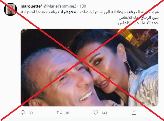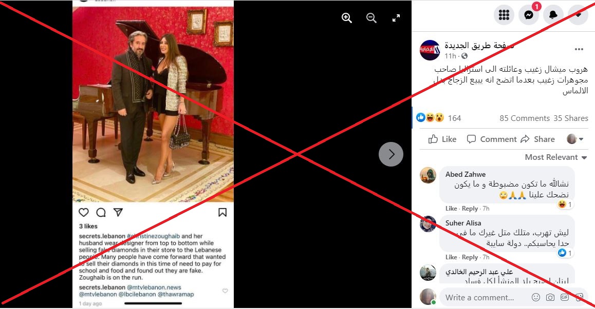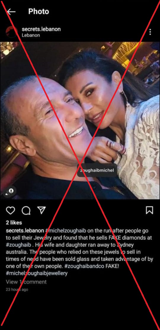 يتداول مستخدمون لوسائل التواصل الاجتماعي منشورا يزعم اكتشاف لبنانيين ان "الماس الذي اشتروه من عند مجوهرات زغيب كان زجاجا، وقد هرب زغيب مع عائلته الى أوستراليا". الا ان هذه المزاعم "كاذبة"، بتأكيد من مسؤولة في شركة Zoughaib & Co. Jewelry (شركة مجوهرات زغيب أند كو) لـ"النهار"، مشيرة الى ان "الشركة رفعت دعوى قضائية ضد مجهول" بتهمة التشهير بالشركة. كذلك، أكدت شركة مجوهرات ميشال زغيب ان "المنشور المتداول عار من الصحة". FactCheck#