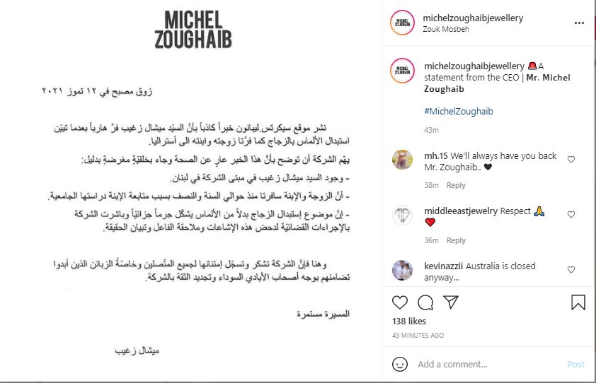 بدورها، نشرت شركة مجوهرات ميشال زغيب بيانا، بعد ظهر اليوم الاثنين، حمل توقيع رئيس مجلس ادارتها ميشال زغيب، أكدت فيه ايضا ان الخبر المتداول "عار من الصحة، وجاء بخلفية مغرضة".