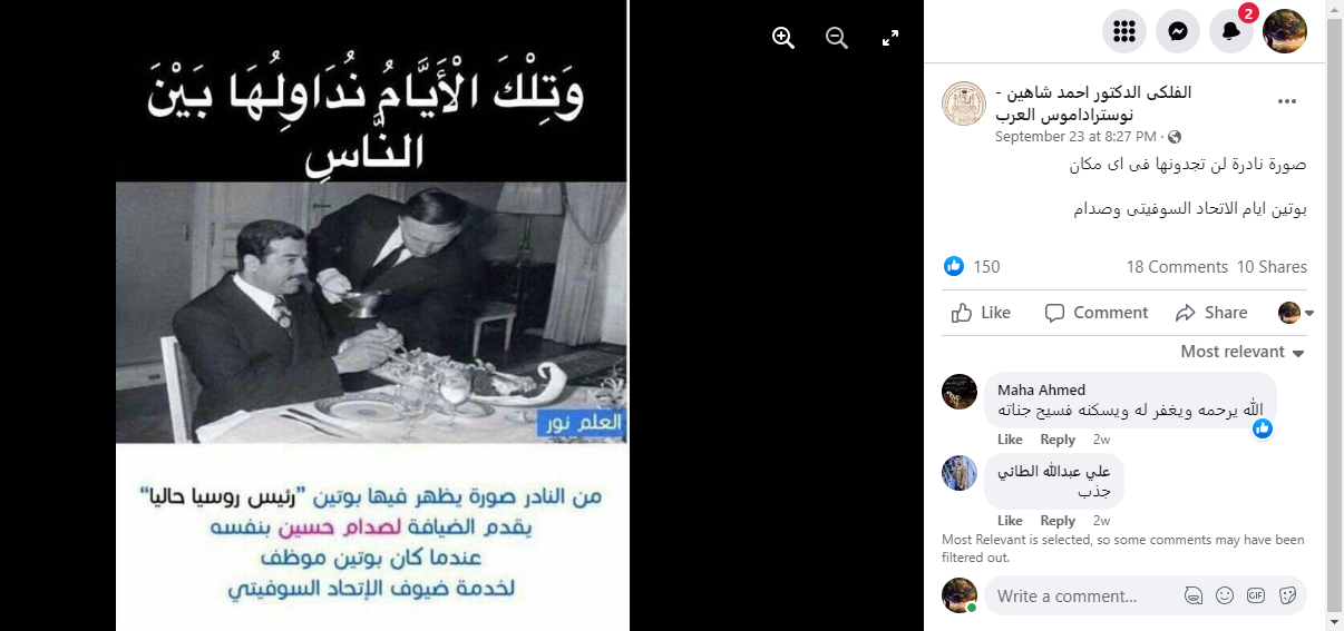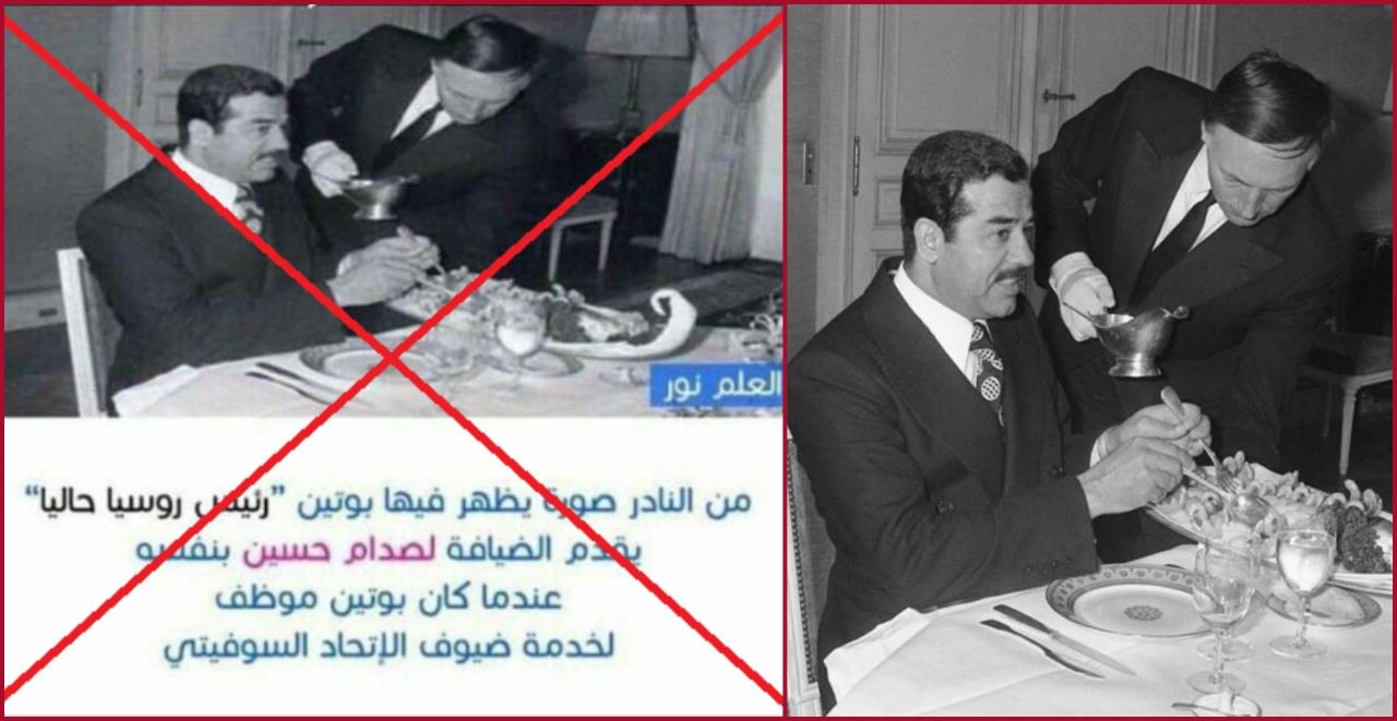 الوقائع: صورة بالابيض والاسود. صدام حسين جلس الى طاولة الطعام ببدلة عادية، والى جانبه رجل حمل آنية. وقد تكثف التشارك فيها أخيرا، عبر حسابات (هنا، هنا...) مرفقة بالمزاعم الآتية (من دون تدخل او تصحيح): "من النادر صورة يظهر فيها بوتين رئيس روسيا حاليا يقدم الضيافة لصدام حسين بنفسه عندما كان بوتين موظف لخدمة ضيوف الاتحاد السوفياتي". وقد سبق ان انتشرت الصورة بالمزاعم عينها في الاعوام الماضية (هنا، هنا، هنا، هنا، هنا...).