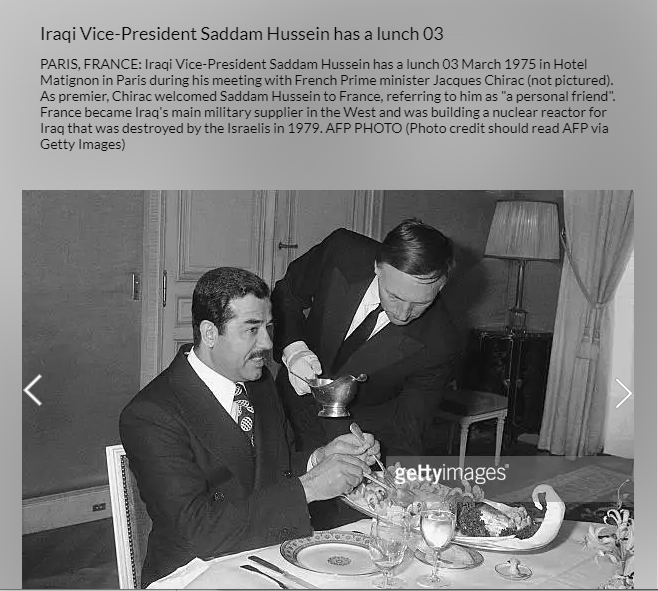 في الواقع، تنشر وكالة Getty Images صورة أخرى (هنا) لغداء صدام حسين وشيراك يومذاك، ويظهر فيها الرجل ذاته الذي كان يقف الى جانب صدام حسين، حاملا الآنية والصينية الكبيرة ذاتها في الصورة قيد التدقيق، لدى دخوله القاعة.