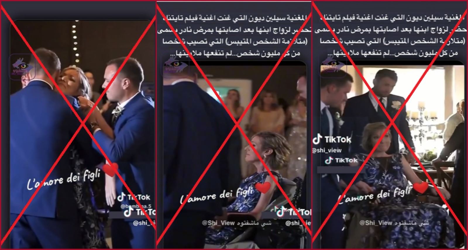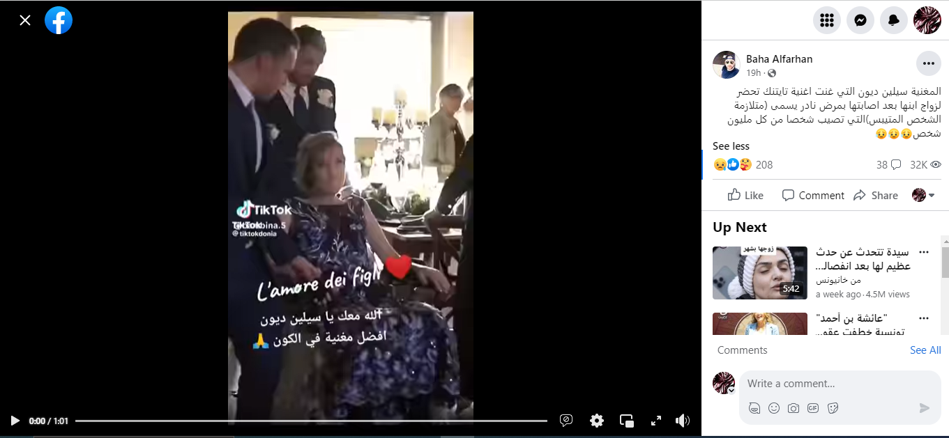 المشاهد تظهر سيدة على كرسي متحرك، تدخل قاعة على ما يبدو، برفقة ثلاثة رجال ببدلات رسمية. واذ يعاونها اثنان منهم على الوقوف، تبدأ رقصة مع الثالث بينما غلبتهما الدموع تأثراً... 1.01 دقيقة مدة الفيديو. منذ ساعات، تكثف التشارك فيه عبر حسابات أرفقته بالمزاعم الآتية (من دون تدخل او تصحيح): "المغنية سيلين ديون التي غنت اغنية تايتنك تحضر لزواج ابنها بعد اصابتها بمرض نادر يسمى (متلازمة الشخص المتيبس) التي تصيب شخصا من كل مليون شخص".
