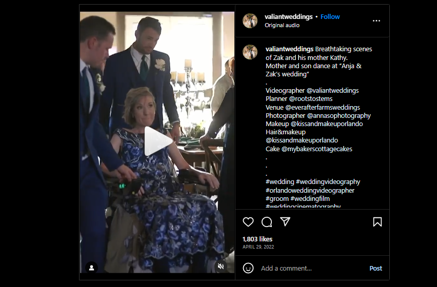 ثانيا، يوصلنا البحث عن الفيديو، بتجزئته الى مشاهد ثابتة (Invid)، إلى مصدره الاصلي، Valiant Weddings، شركة الإنتاج الرائدة في صناعة تصوير حفلات الزفاف، ومقرها في أورلاندو بولاية فلوريدا الاميركية، والتي نشرته في حسابها في انستغرام (هنا)، في 29 نيسان 2022. وكتبت معه: "مشاهد تحبس الانفاس لزاك ووالدته كاثي. أم وابنها يرقصان في زفاف أنجا وزاك".