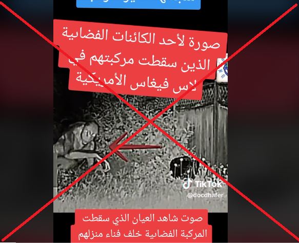 تضج وسائل التواصل الاجتماعي بفيديو يظهر، وفقا للمزاعم، "أول لقطة لكائن فضائي وقعت مركبته في فناء منزل عائلة في لاس فيغاس الأميركية"، والتي نشرت مواقع اخبارية اميركية تقارير عنها أخيرا. الا ان هذا الزعم مختلق. في الواقع، هذه المشاهد ليست حقيقية، لكونها تلاعباً رقمياً. FactCheck#