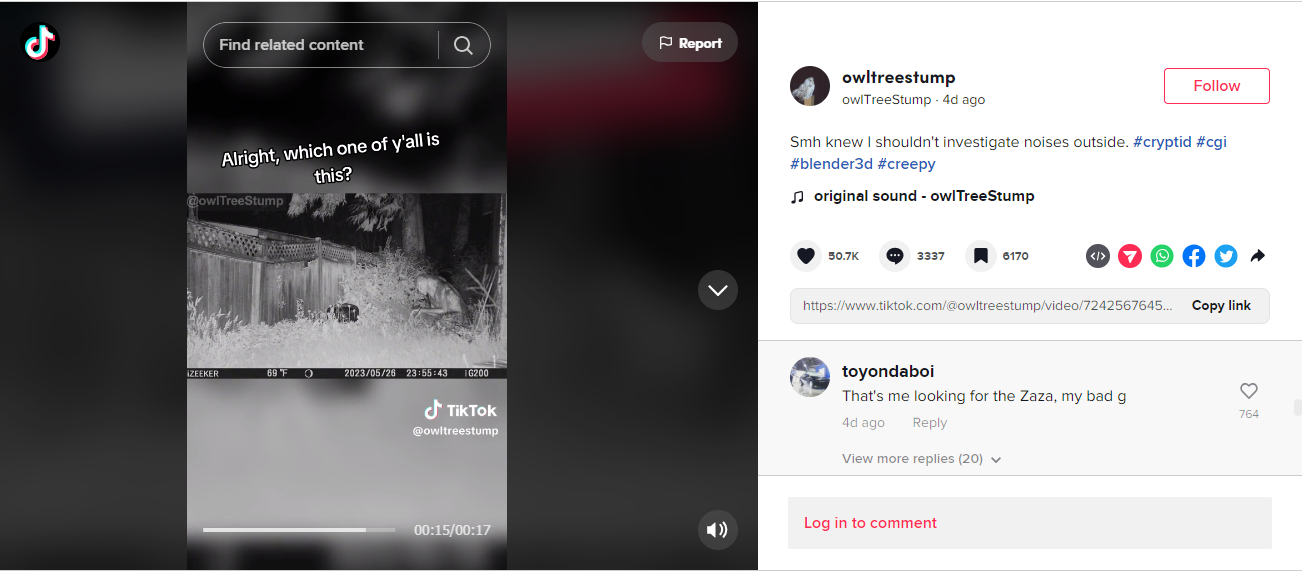 كذلك، يضعنا البحث امام نسخ من الفيديو حملت أعلاها الى اليسار توقيعا مجتزأ (هنا، هنا...)، يوصلنا، بعد محاولات عدة، الى مصدره الأصلي، حساب owlTreeStump@ المتخصص بالمؤثرات البصرية. وقد نشره (هنا)، مرفقا بوسوم عدة، منها CGI اي صور منشأة بالحاسوب وblender 3g (او نمذجة ثلاثية الأبعاد)، بما يدل على ان المشاهد ليست حقيقية. مجرد تلاعب رقمي.