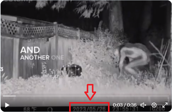 اول ملاحظة: انظروا اسفل الفيديو في الوسط، حيث ظهر تاريخه: 26-5-2023. وهذا يخالف التاريخ الذي حُدِّد لليلة مشاهدة "الكائنات غير البشرية" في فناء منزل العائلة في لاس فيغاس. وهو 1 ايار 2023، وفقا لما يُقرَأ في تسجيل شرطة مترو لاس فيغاس (هنا).