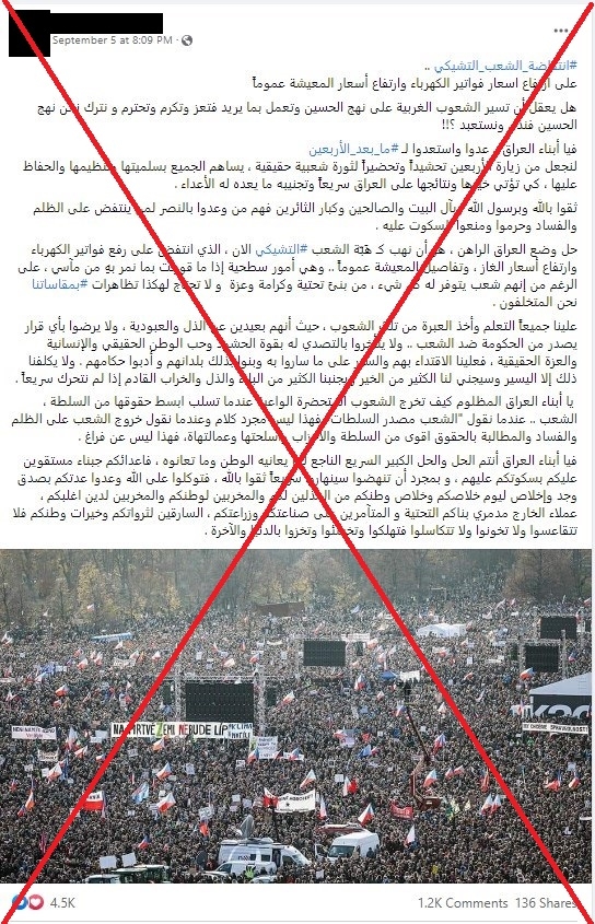 في ظلّ التحديات الاقتصادية التي تعيشها أوروبا ومع ارتفاع كلفة الطاقة بسبب الحرب الروسيّة الأوكرانيّة، ظهرت على صفحات وحسابات عربية على مواقع التواصل الاجتماعي صورة قيل إنها تُظهر "احتجاجات في تشيكيا على ارتفاع فواتير الكهرباء والمعيشة عموماً". إلا أن الصورة تعود لسنة 2019، ولا علاقة لها بأزمة الطاقة في أوروبا.