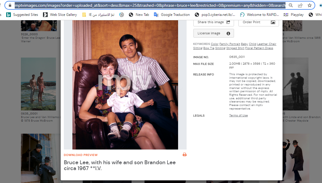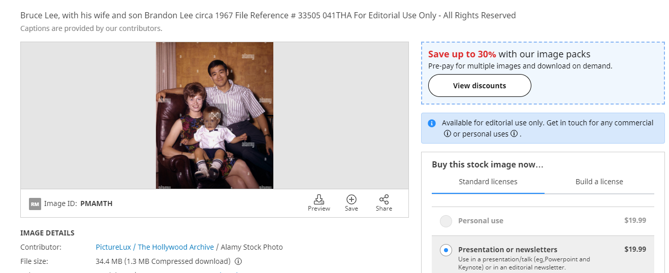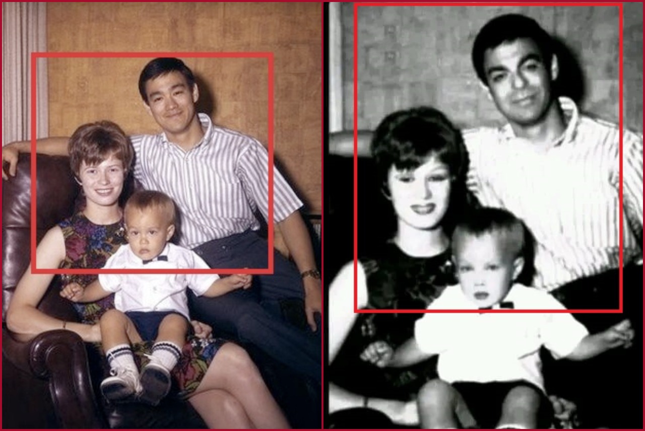 فالبحث العكسي عن الصورة يضعنا فورا امام الصورة الاصلية الملوّنة منشورة في موقع آلامي Alamy (هنا، وهنا، هنا ايضا)، مع شرح انها تظهر ممثل الفنون القتالية الشهير بروس لي مع زوجته (ليندا لي كادويل) وابنه براندون حوالى عام 1967.