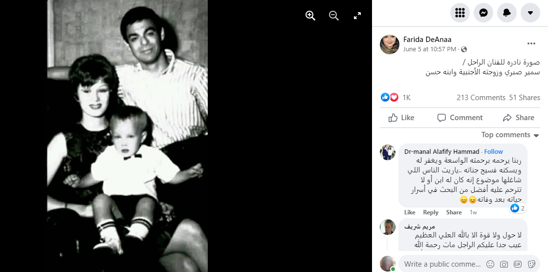 الوقائع: صورة بالابيض والاسود يبدو فيها الفنان المصري الراحل سمير صبري. منذ ايام عدة، تكثف التشارك فيها، عبر صفحات وحسابات (هنا، هنا، هنا، هنا، هنا، هنا...). وقد أرفقت بالمزاعم الآتية (من دون تدخل او تصحيح): "صورة نادره للفنان الراحل / سمير صبري وزوجته الأجنبية وابنه حسن".