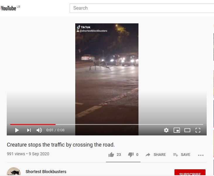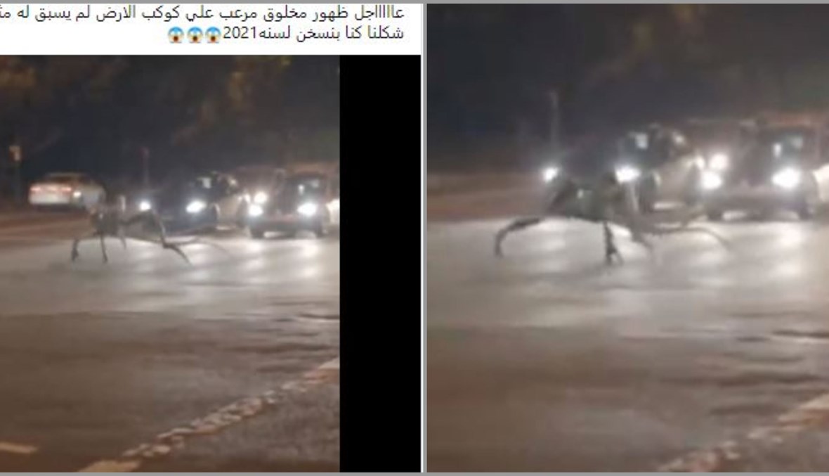 الوقائع: 24 ثانية فقط مدة الفيديو. المشاهد تكشف عن كائن غريب يعبر الطريق أمام السيارات ليلا، قبل ان يتابع سيره في ما يشبه حديقة، ومن ثم في شارع. التشارك في المقطع على نطاق واسع، وقد أرفق بالمزاعم الآتية (من دون تدخل): "عاااااجل ظهور مخلوق مرعب علي كوكب الارض لم يسبق له مثيل احنا شكلنا كونا بنسخن لسنه2021" (مثل هنا، هنا، هنا، هنا، هنا...).