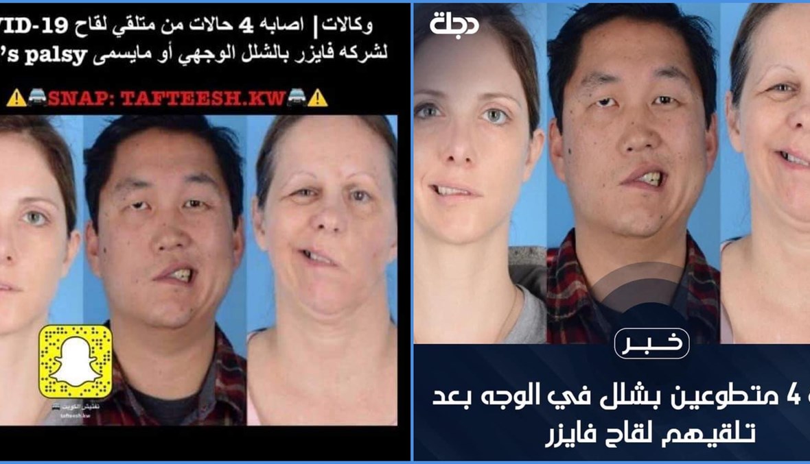 يتناقل مستخدمون لوسائل التواصل الاجتماعي صورة بمزاعم أنها تظهر "إصابة 4 متطوعين بشلل في الوجه بعد تلقيهم لقاح فايزر". غير أن هذا الادعاء مضلل، خاطئ. الصورة المتناقلة لا تظهر حقيقة المتطوعين الذين أصيبوا بشلل في الوجه. وهي صورة عامة استخدمت سابقاً في مقالات طبية للكلام على شلل بيل. ومع أن التقرير عن "إصابة أربعة متطوعين بشلل بيل بعد تلقيهم لقاح فايزر/بيونتيك" صحيح، الا انه تجدر الإشارة الى أن إدارة الغذاء والدواء الأميركية (FDA) قالت إنه "لا يوجد بعد أساس واضح يمكن البناء عليه لاستنتاج علاقة سببية" بين اللقاح وشلل بيل. FactCheck#