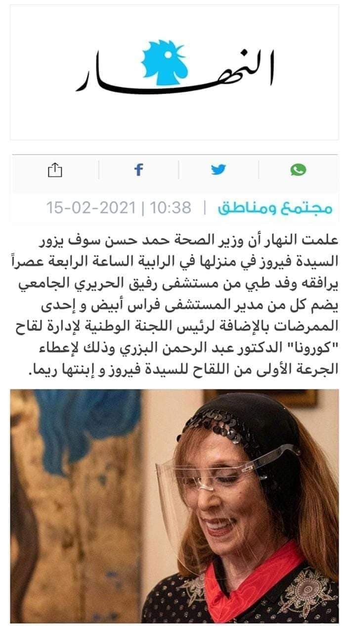 يتناقل مستخدمون لوسائل التواصل الاجتماعي خبرا منسوبا الى جريدة "النهار" يزعم ان "وزير الصحة حمد حسن سيزور السيدة فيروز في منزلها في الرابية عصرا، برفقة وفد طبي من مستشفى رفيق الحريري الجامعي، لاعطائها الجرعة الأولى من اللقاح ضد فيروس كورونا المستجد". غير أن هذا الخبر لم تنشره "النهار"، كما يتم زعمه، ولا أساس له.