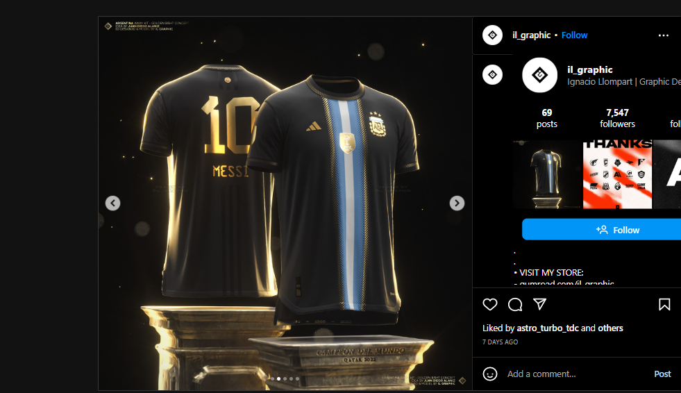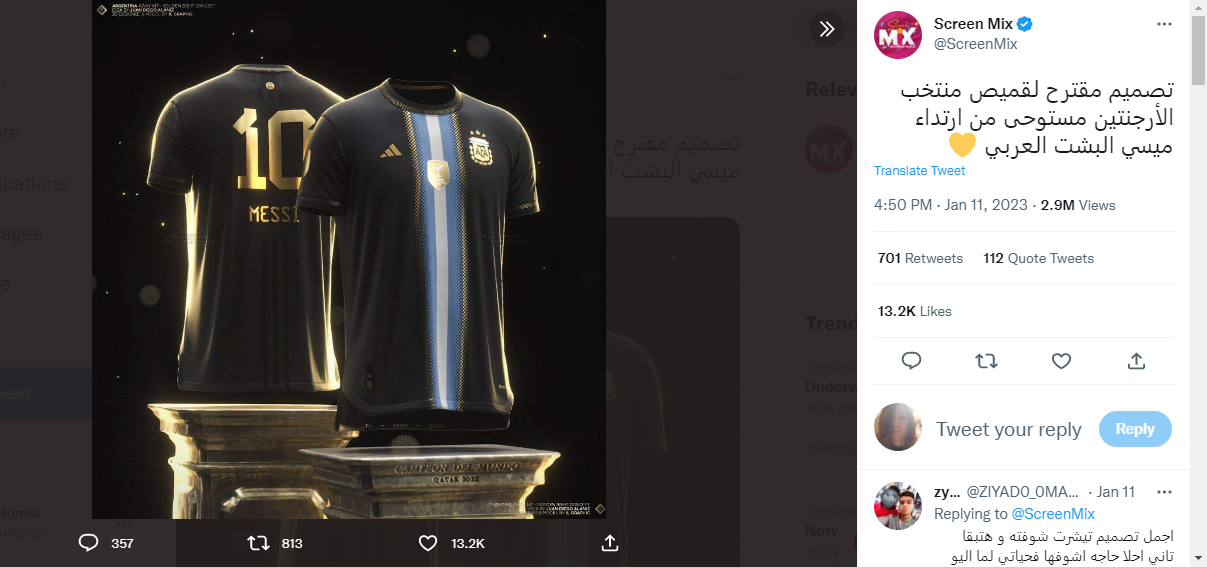 واوضح أن هذا "القميص من تصميم jdalaniz94@ الذي سعى الى تمثيل البشت الذي وضعه ميسي خلال رفع كأس العالم. ويحمل القميص رقع بطل كوبا أميركا، الفيناليسيما، وكأس العالم في قطر 2022".