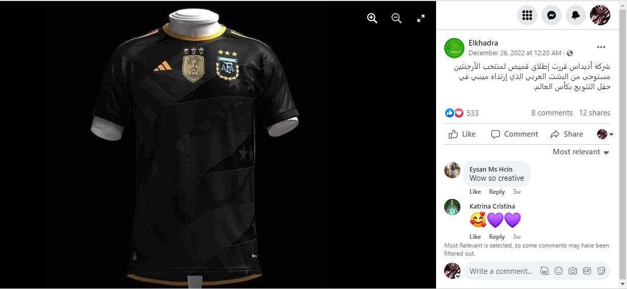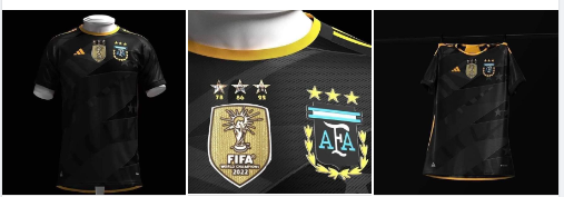 قميصان رياضيان اسودان، "وأجمل تصميم"، في تعبير مستخدمين لوسائل التواصل الاجتماعي. الصور تنتشر في حسابات، عربية وأجنبية، بمزاعم انها تظهر "قميص منتخب الأرجنتين الذي صممته شركة اديداس والمستوحى من البشت العربي الذي لبسه ميسي في احتفال التتويج" (هنا، هنا، هنا، هنا، هنا، هنا، هنا، هنا، هنا...)، بينما ذكرت حسابات اخرى انه "تصميم مقترح لقميص منتخب الأرجنتين مستوحى من ارتداء ميسي البشت العربي" (هنا، هنا، هنا...).