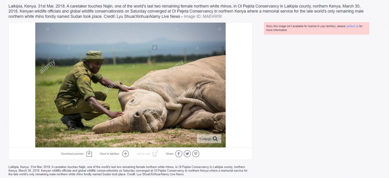 أرشد البحث عن الصورة إلى النسخة الأصلية منها منشورة في موقع آلامي لتخزين الصور عام 2018. وقد جاء في النصّ المرفق بها أنها تظهر عاملاً في محميّة أول بيجيتا (Ol Pejeta) في كينيا يداعب أنثى وحيد قرن أبيض شمالي تدعى "نجين".