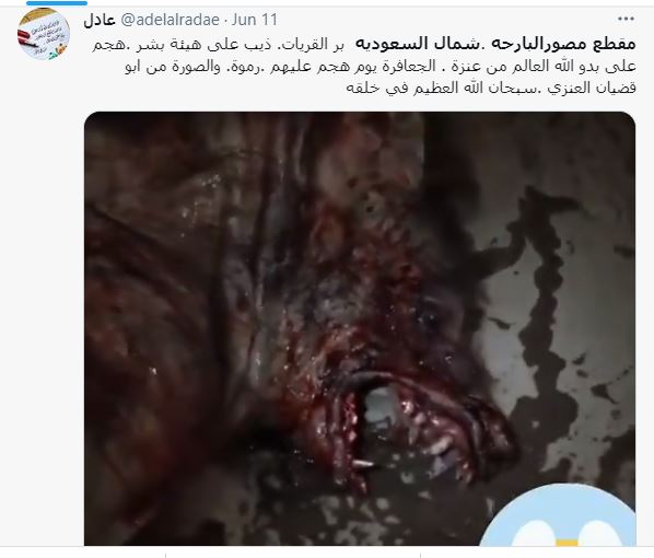الوقائع: 0,19 ثانية فقط مدة الفيديو. المشاهد تكشف رأس ذئب تلطخ بالدماء، وكان ملقى على الأرض. وتظهر الثواني الاخيرة من الفيديو ان جسم الحيوان يشبه جسما بشريا، بيدين ورجلين... منذ ايام عدة، تكثف التشارك في المقطع، عبر صفحات وحسابات، في الفايسبوك (هنا...)، وتويتر (هنا، هنا، هنا...)، وايضا عبر يوتيوب (هنا، هنا، هنا...). وقد أرفق بالمزاعم الآتية (من دون تدخل أو تصحيح): "مقطع مصور البارحه. شمال السعوديه بر القريات. ذيب على هيئة بشر. هجم على بدو الله العالم من عنزة. الجعافرة يوم هجم عليهم. والصورة من ابو قضيان العنزي..."، وايضا "ذئب على هيئة بشر شمال السعوديه (القريات) يهجم على مواطنين".