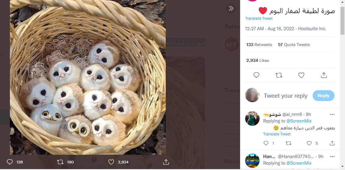 الوقائع: السلة ضمّت عددا من طيور البوم الصغيرة. منذ ساعات، تكثف التشارك في الصورة عبر صفحات وحسابات في الفايسبوك (هنا، هنا، هنا...)، وتويتر (هنا...)، مرفقة بالمزاعم الآتية (من دون تدخل): "صورة لطيفة لصغار البوم".