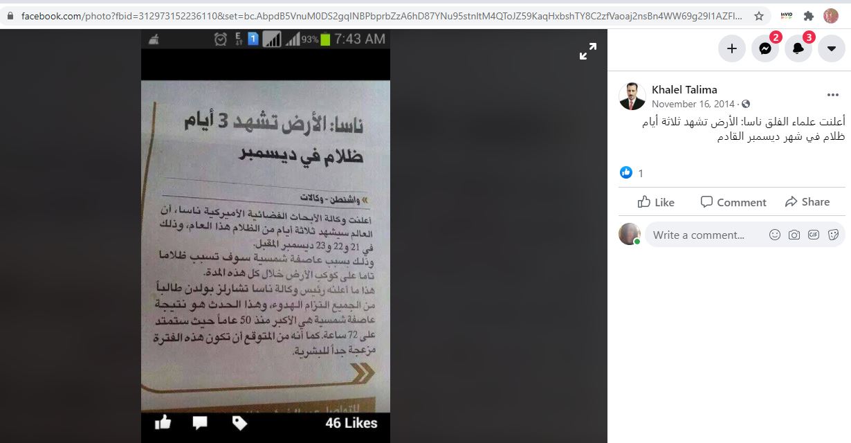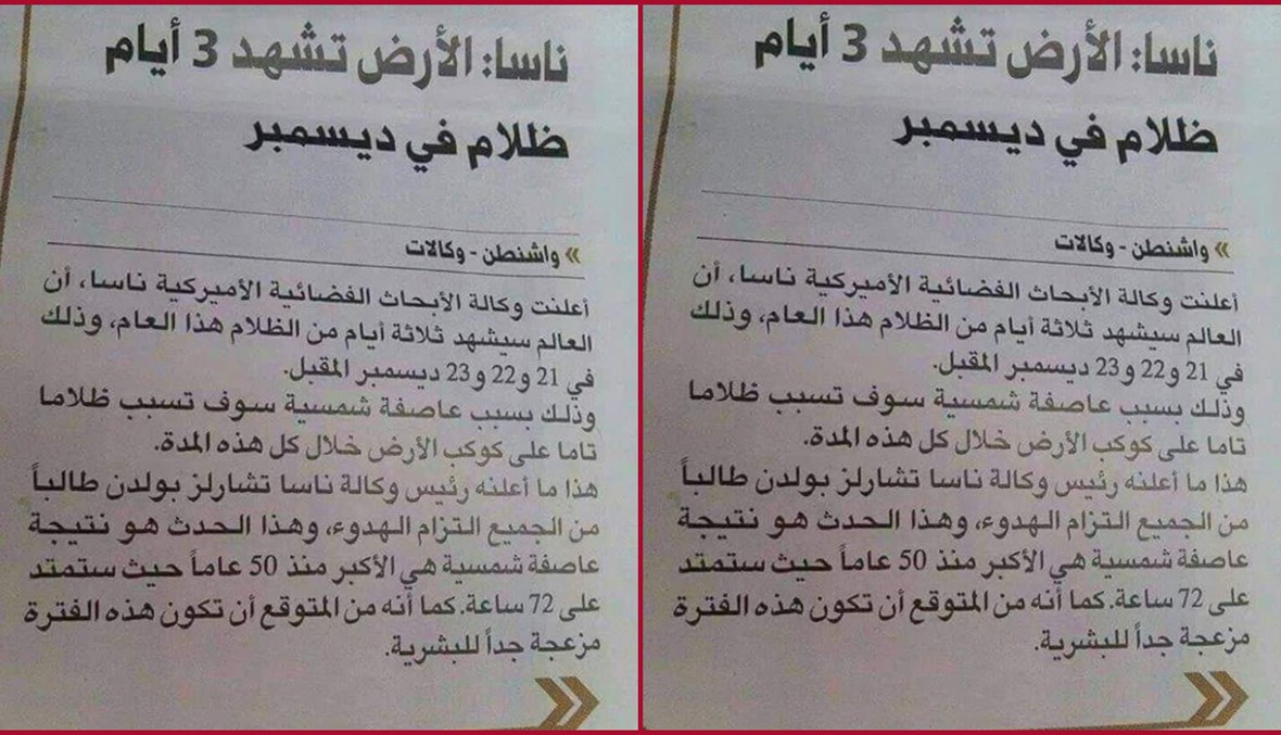 الوقائع: قصاصة من مطبوعة تكثف تناقلها أخيرا، لا سيما عبر الواتساب والفيسبوك (مثل هنا، هنا...). الخبر "من واشنطن"، ومصدره "الوكالات"، على ما كتب. والعنوان "الناسا: الأرض تشهد ثلاثة ايام ظلام في ديسمبر". وجاء في سياق النص (من دون تدخل): "أعلنت وكالة الأبحاث الفضائية الأميركية ناسا أن العالم سيشهد ثلاثة أيام من الظلام هذا العام، وذلك في 21 و22 و23 ديسمبر/ كانون الأول المقبل، وذلك بسبب عاصفة شمسية سوف تسبب ظلاماً تاماً على كوكب الأرض خلال كل هذه المدة. هذا ما أعلنه رئيس وكالة ناسا تشارلز بولدن، طالباً من الجميع التزام الهدوء...".